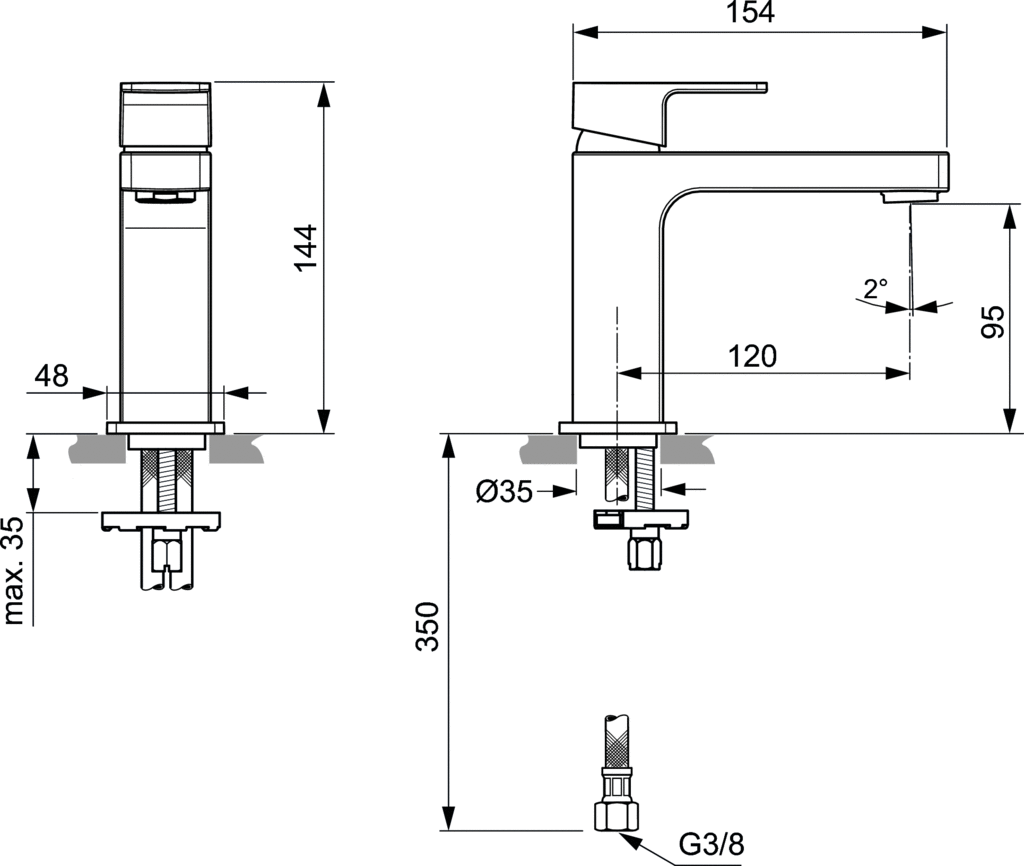 Bateria umywalkowa bez metalowego korka automatycznego. Głowica ceramiczna IS 28 mm. Metalowy uchwyt z logo Ideal Standard oraz nadrukowanymi czerwonymi i niebieskimi oznaczeniami. Aerator typu Perlator M24x1 - z ogranicznikiem przepływu wody do 5l/min. Metalowy pierścień uszczelniający. Klasa akustyczna 1. Wężyki przyłączeniowe PEX G3/8". System montażu EASY-FIX. Zgodna z EN817.