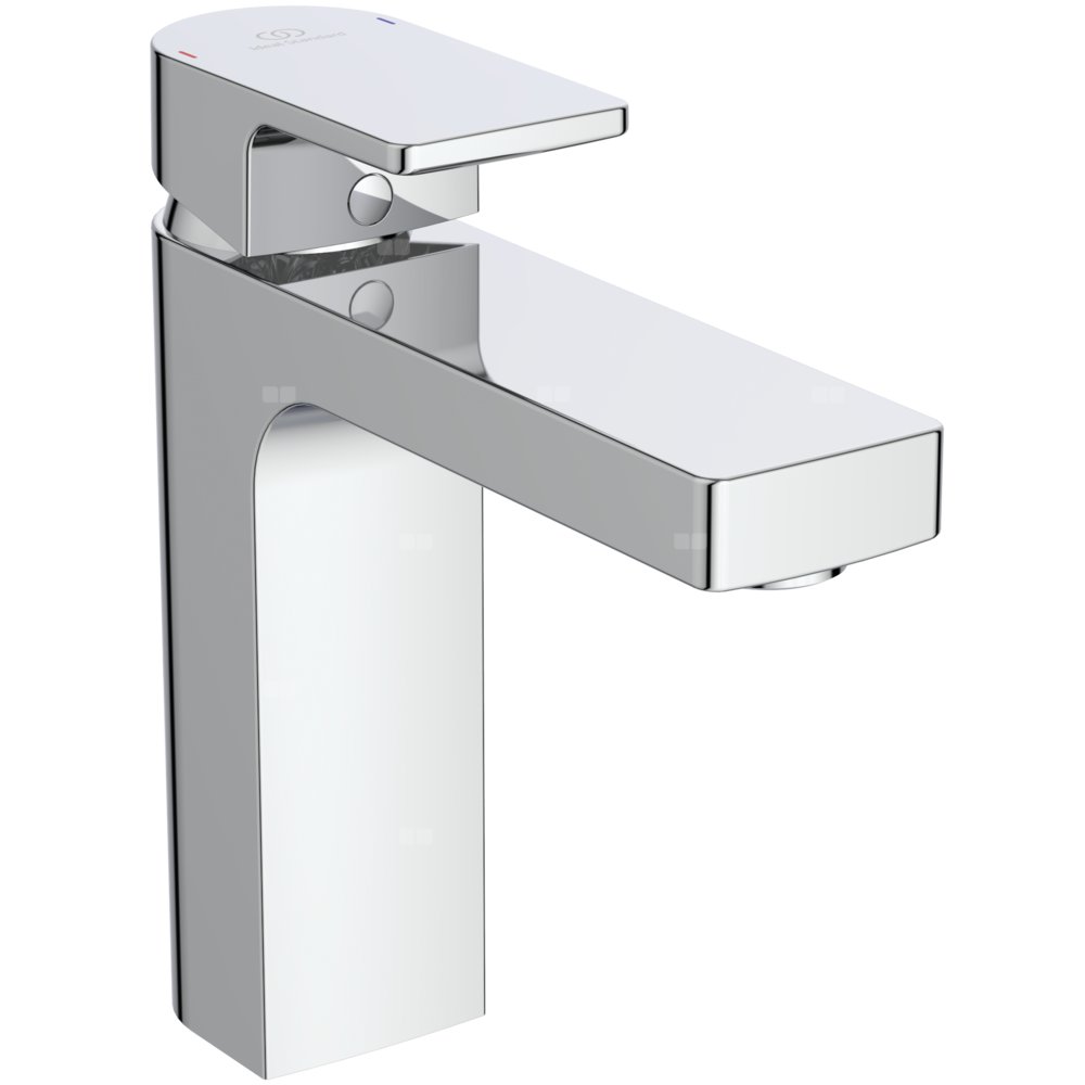 Bateria umywalkowa Grande z metalowym korkiem automatycznym. Głowica FirmaFlow ISI 38 mm z ogranicznikiem temperatury. Metalowy uchwyt z logo Ideal Standard oraz nadrukowanymi czerwonymi i niebieskimi oznaczeniami. Aerator typu Perlator M24x1 - z ogranicznikiem przepływu wody do 5l/min. Klasa akustyczna 1. Wężyki przyłączeniowe PEX G3/8". System montażu EASY-FIX. Zgodna z EN817.