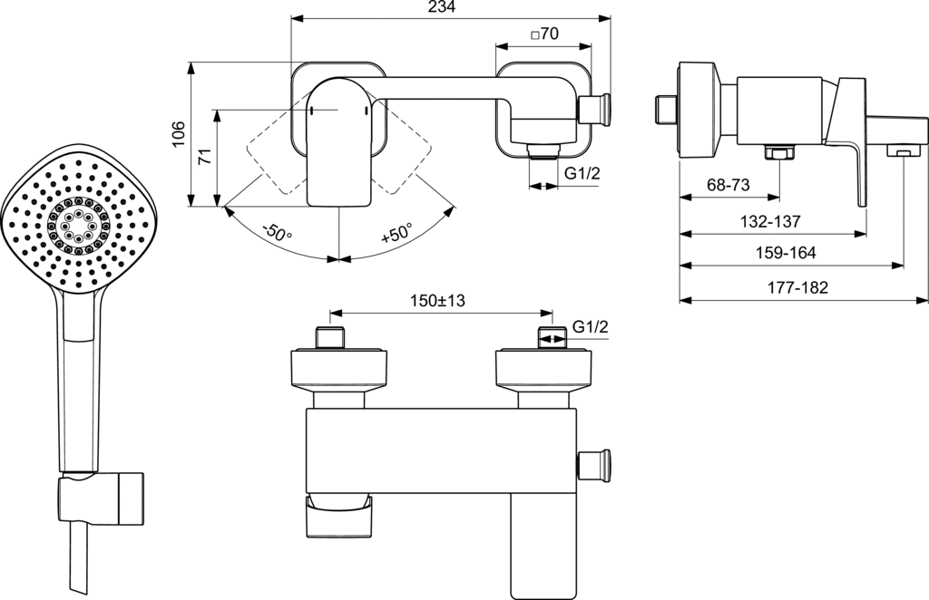 Bateria wannowo-natryskowa ścienna z akcesoriami. Głowica FirmaFlow ISI 38 mm z ogranicznikiem temperatury. Smukły, mosiężny, odlewany korpus. Automatyczny przełącznik. Metalowy uchwyt z logo Ideal Standard oraz nadrukowanymi czerwonymi i niebieskimi oznaczeniami. Zawór zwrotny. Perlator typu Cascade. Osłona śrub przyłączeniowych, ukryte przyłącza mimośrodowe baterii. Klasa akustyczna 1. Zgodna z EN817. Akcesoria: 3-funkcyjna słuchawka prysznicowa, ruchomy uchwyt ścienny, wąż natryskowy.