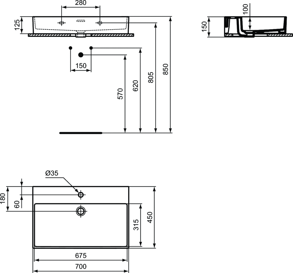 Umywalka Extra mocowana do ściany z 1 wybitym otworem na baterię oraz przelewem. Nieszlifowana od spodu (szkliwiona od spodu): nieodpowiednia do montażu na blacie (nie zapewnia dostatecznie płaskiej powierzchni). Dowiedz się więcej o zalecanym wyposażeniu w katalogu lub cenniku Atelier Collections.