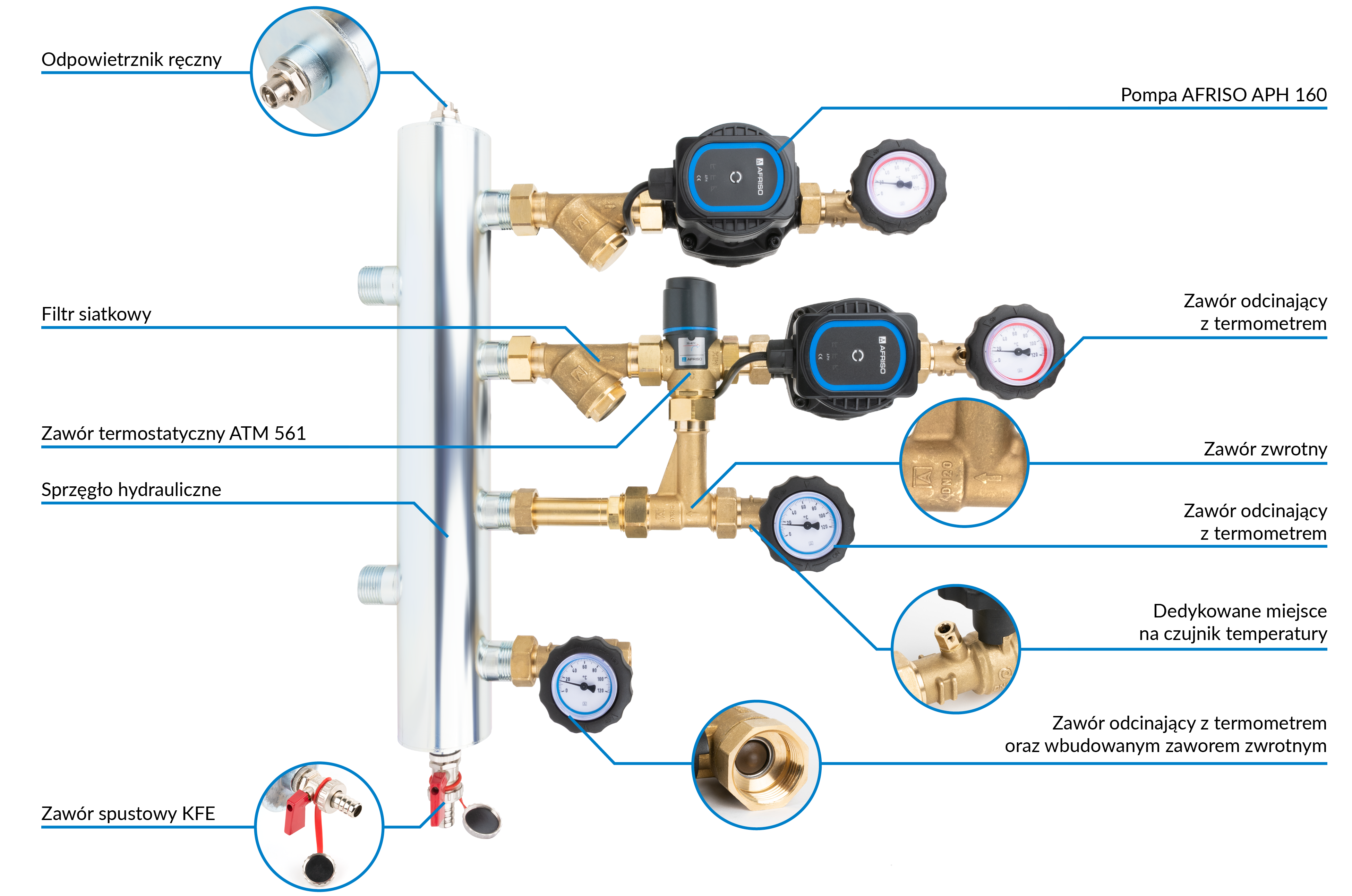 Termostatyczny zawór mieszający ATM 561 (Kvs 2,5 m³/h) z zakresem regulacji temperatury zasilania 20-43°C.