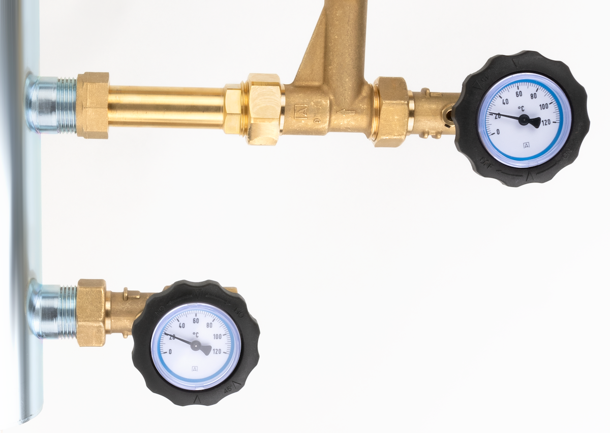 Zawory odcinające ze zintegrowanymi termometrami do kontroli temperatury medium na każdym przyłączu.