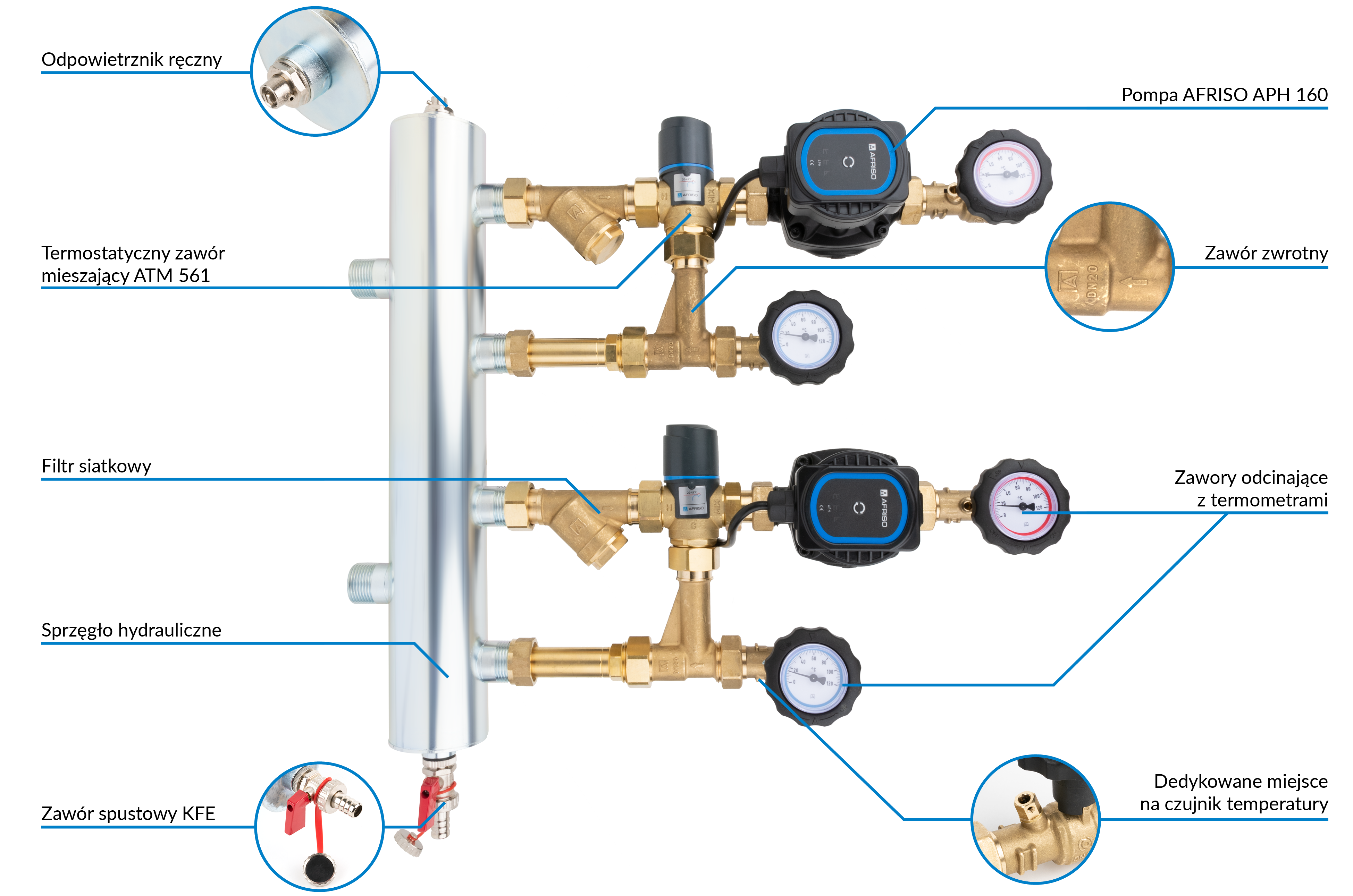 Zawory odcinające ze zintegrowanymi termometrami do kontroli temperatury medium na każdym przyłączu.