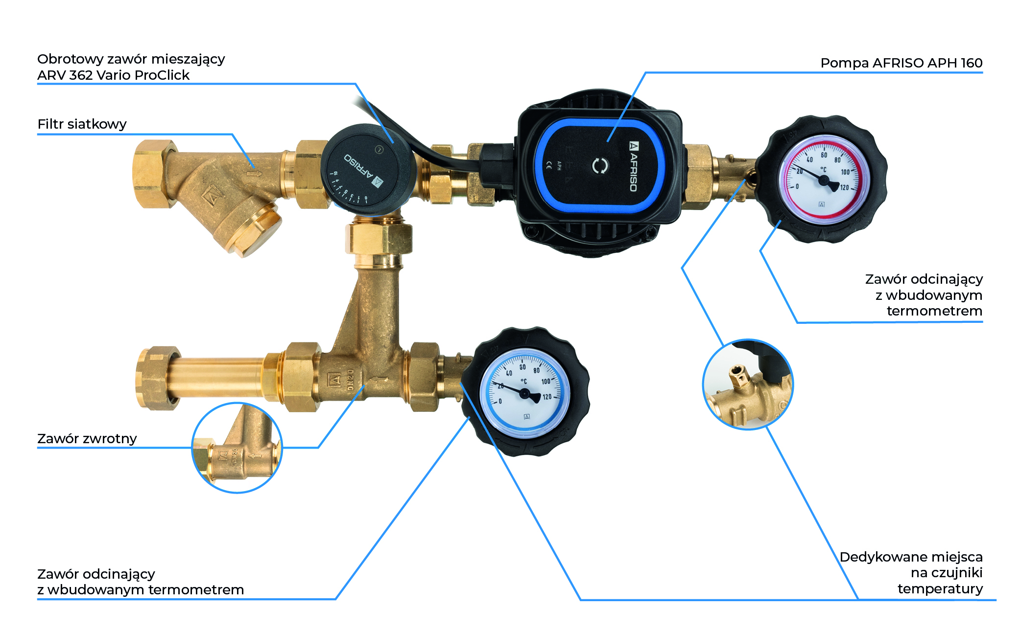 Filtr siatkowy chroni pompę oraz zawór mieszający przed zanieczyszczeniami.