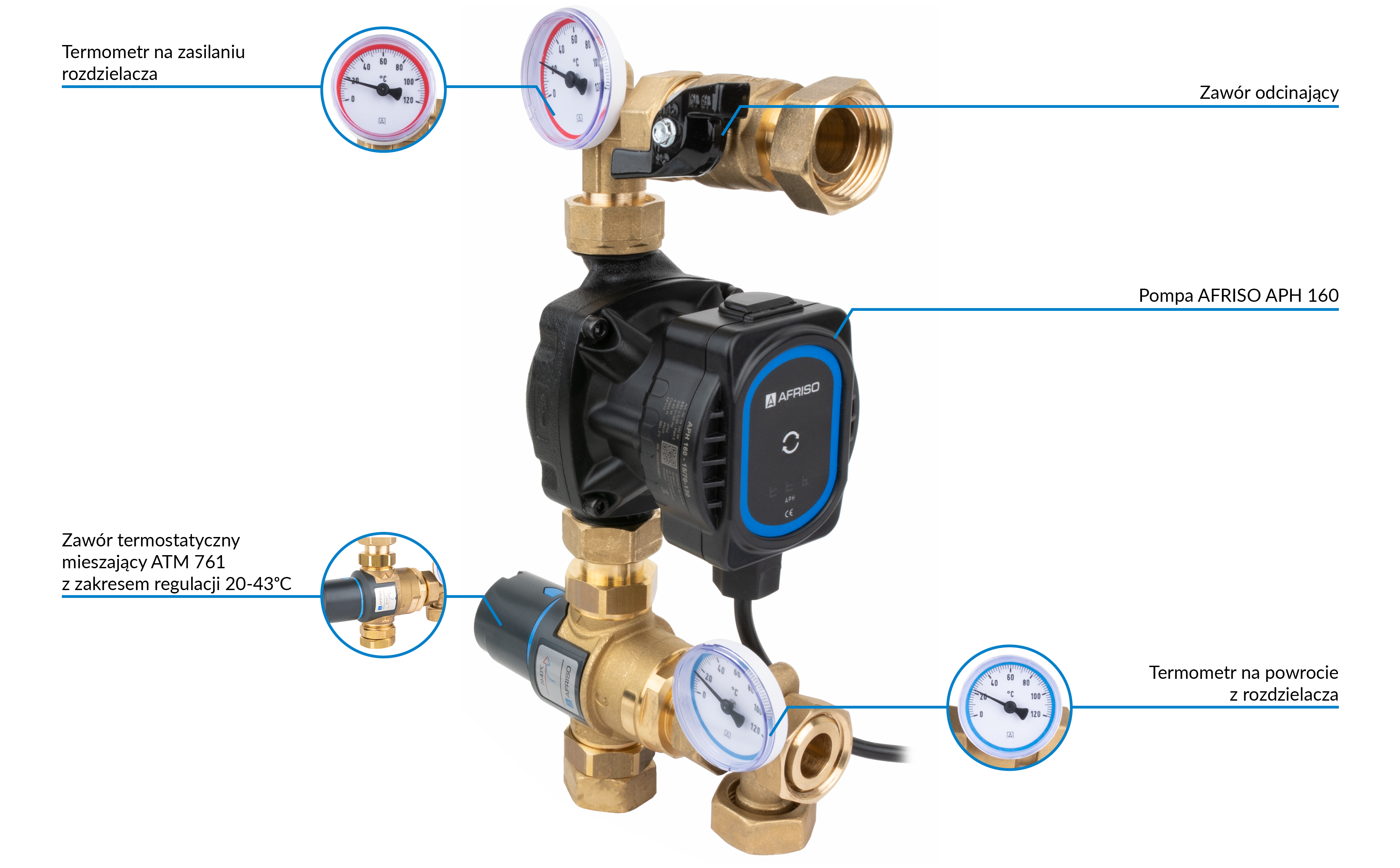 Stosowany w instalacjach grzewczych.Montowany między źródłem ciepła a rozdzielaczem ogrzewania płaszczyznowego w szafce rozdzielacza.