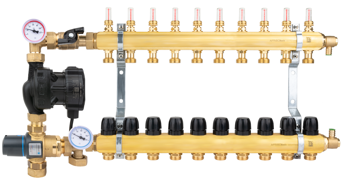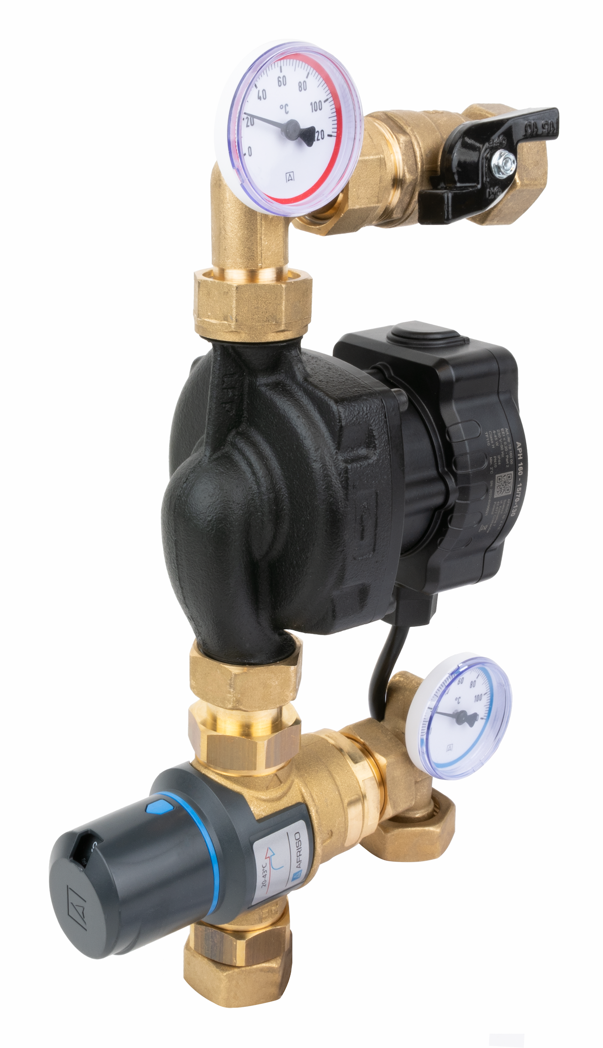 Grupa pompowa AFRISO BTU 502 AP nakrętka x nakrętka 1'' x 1'', z zaworem termostatycznym, z pompą obiegową AFRISO APH 160 15-7/130 mm