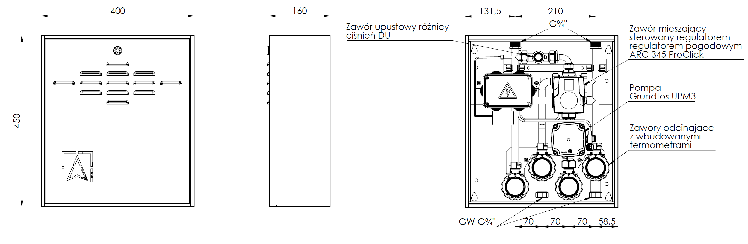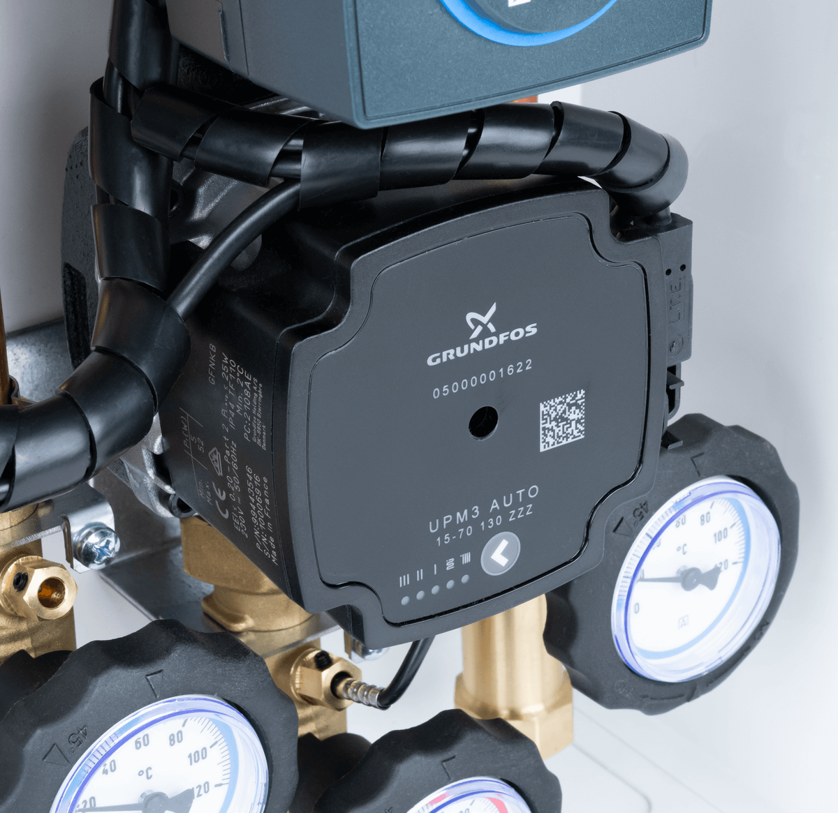 Zawór mieszający oraz pompa obiegowa sterowane są regulatorem pogodowym ARC 345 ProClick, który reguluje temperaturę na podstawie temperatury zewnętrznej i ustawionej krzywej grzewczej.