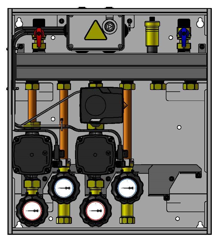 - Zastępuje skomplikowane instalacje ze sprzęgłami, rozdzielaczami, zaworami mieszającymi – 80% kotłowni w jednej szafce.