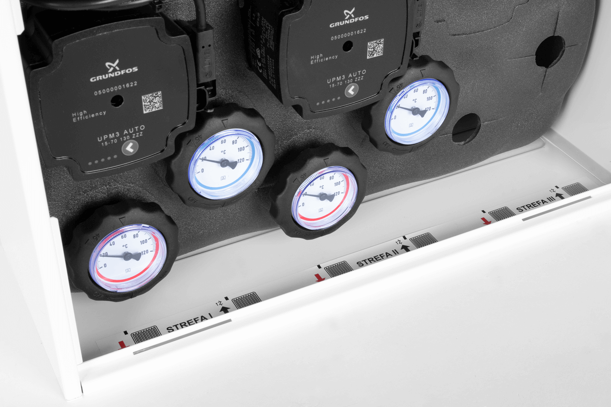 Zastępuje skomplikowane instalacje ze sprzęgłami, rozdzielaczami, zaworami mieszającymi – 80% kotłowni w jednej szafce.