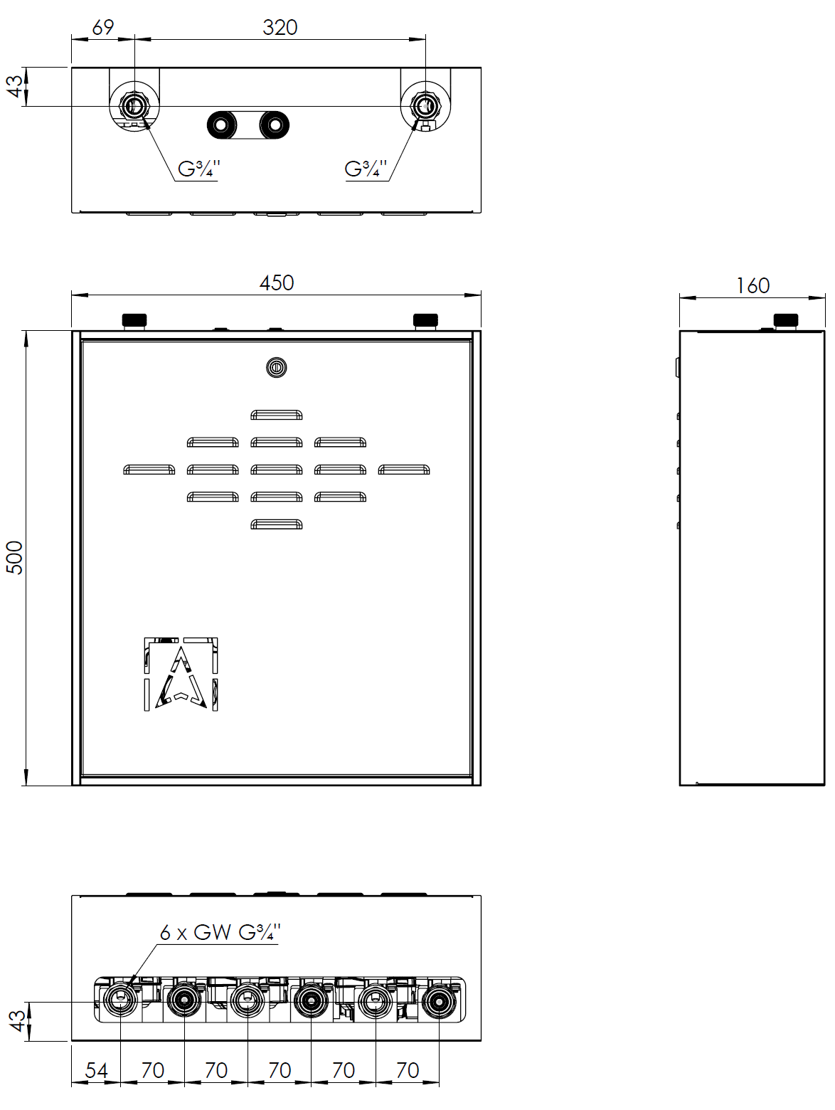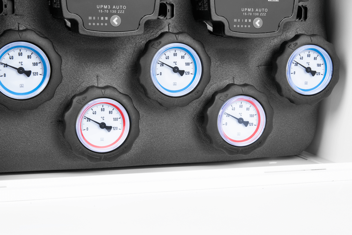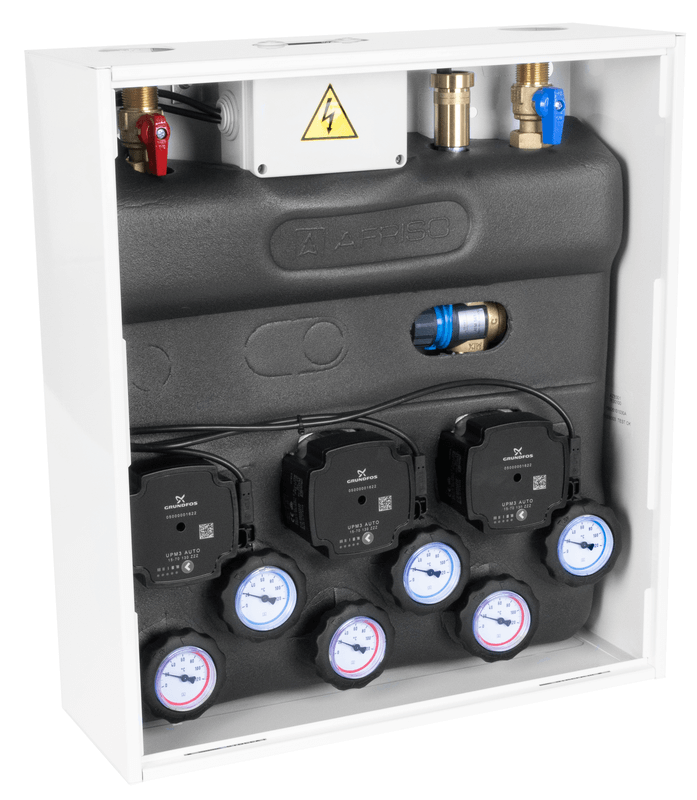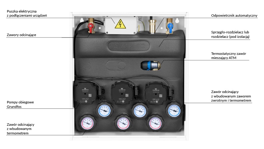 Wyposażony w pompy Grundfos UPm³ i termostatyczny zawór mieszający ATM 561 z regulacją 20 ÷ 43°C. Zakres dobrany na podstawie optymalnych temperatur zasilania instalacji ogrzewania podłogowego.