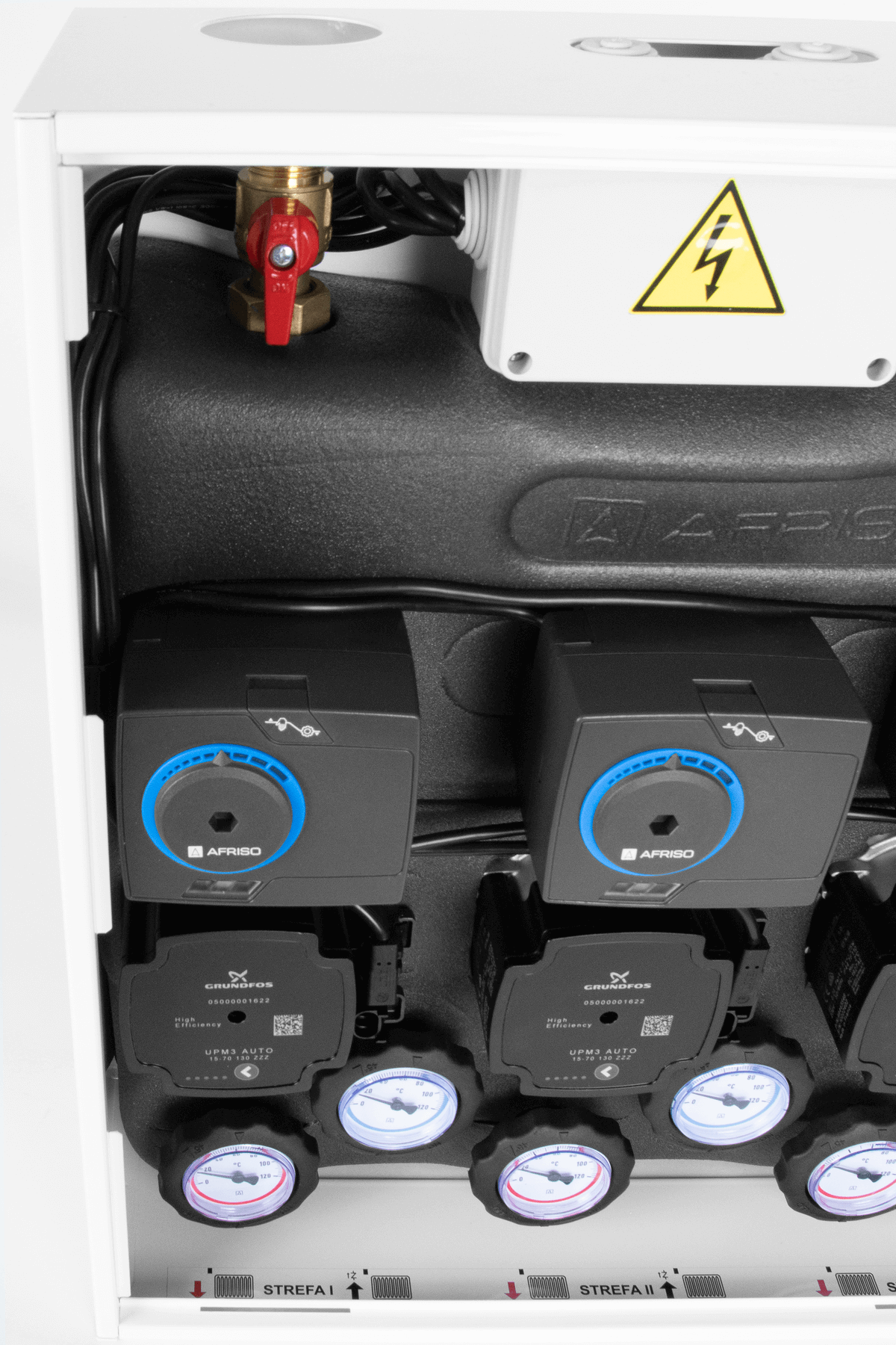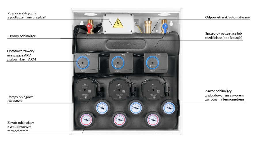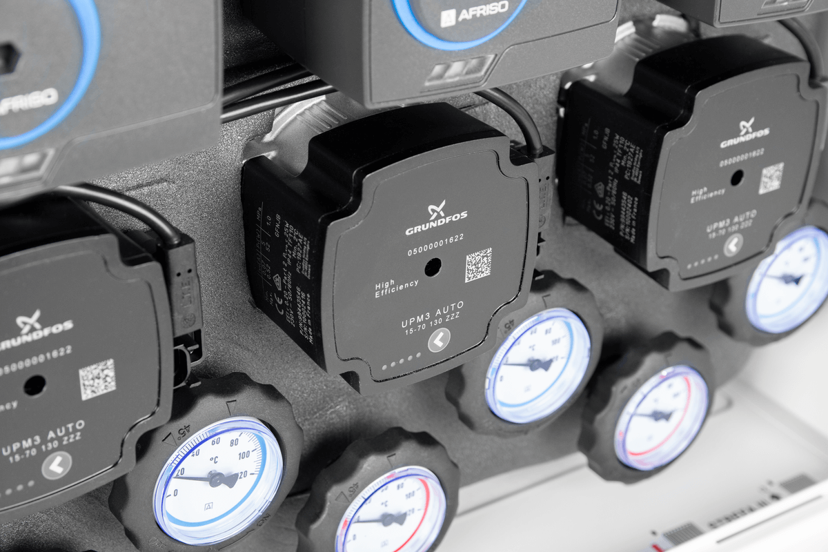 Wyposażony w pompy Grundfos UPm³ oraz zawory obrotowe z siłownikami ARM 141.