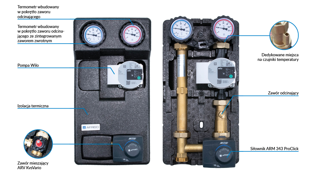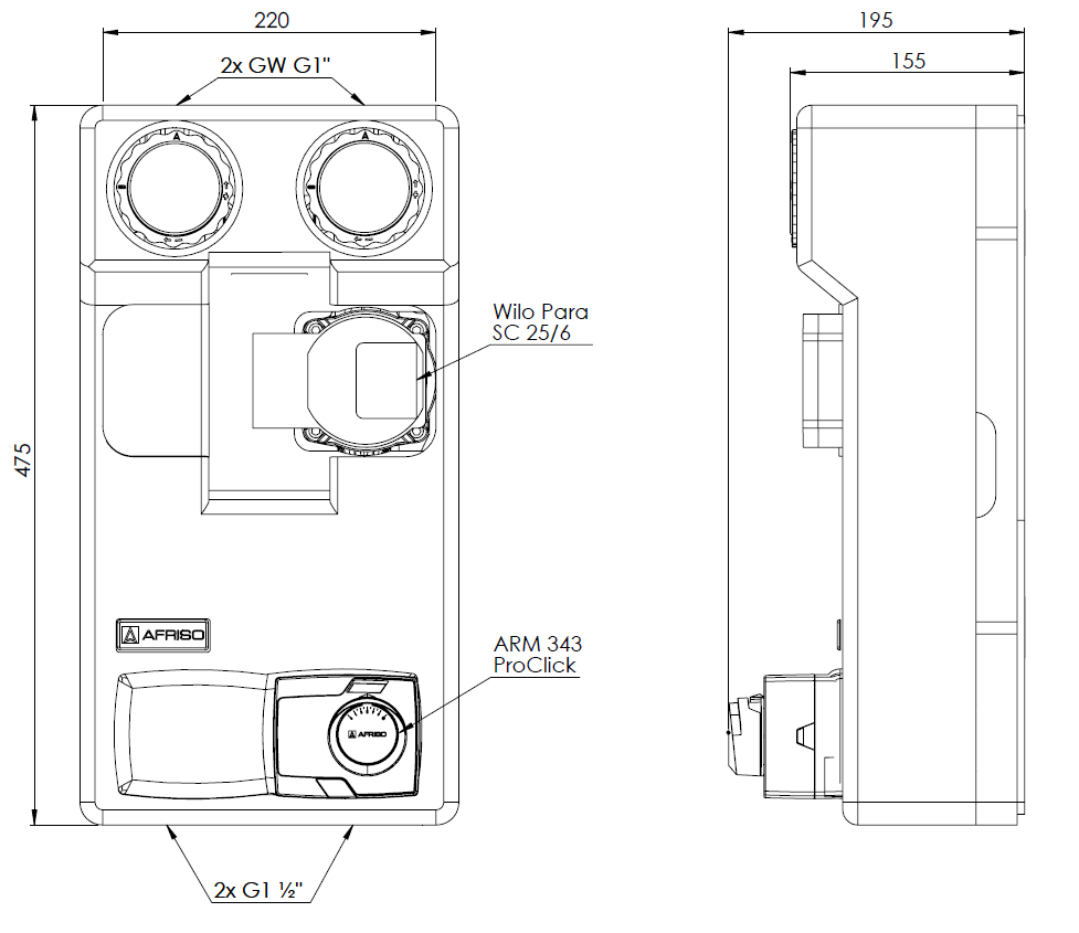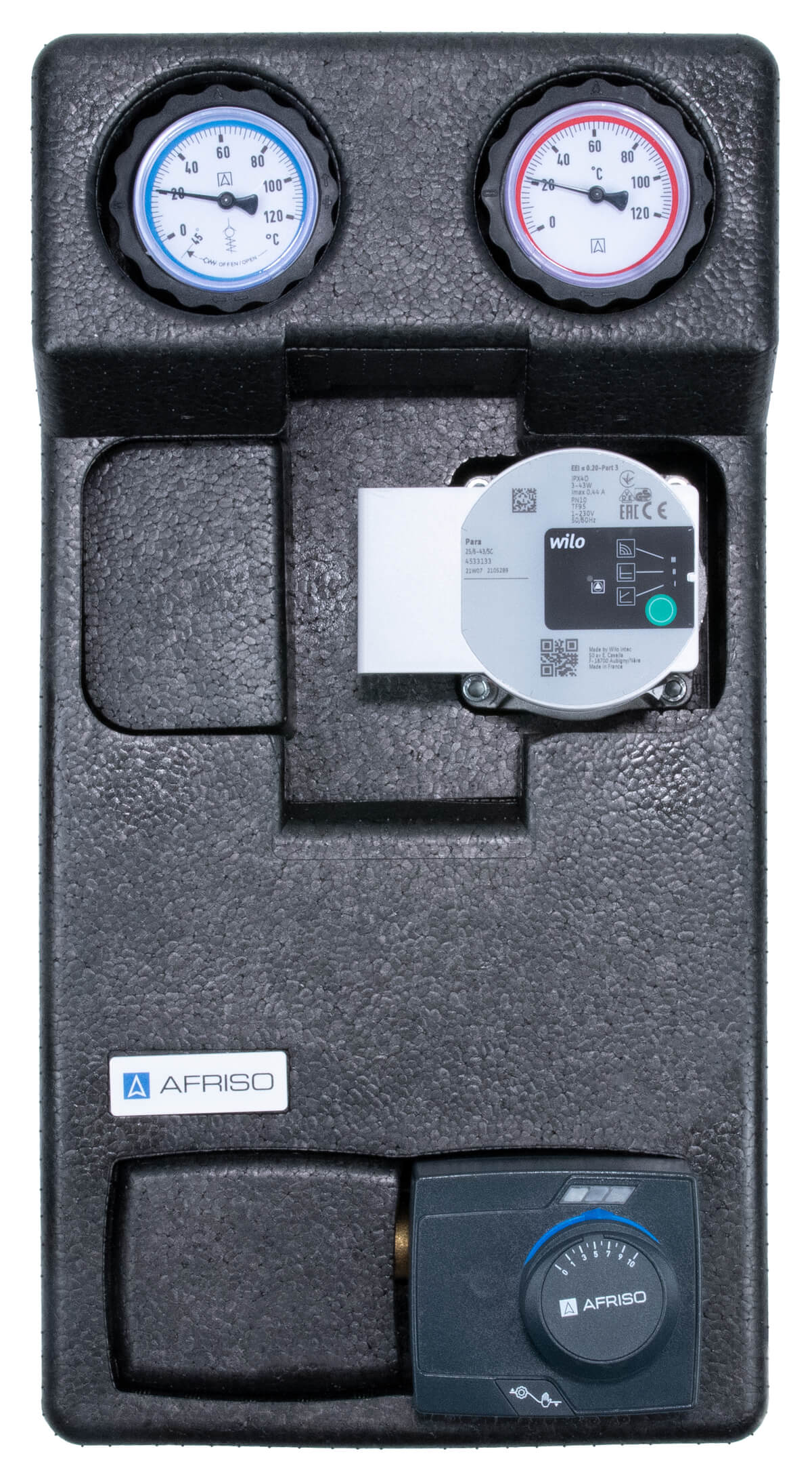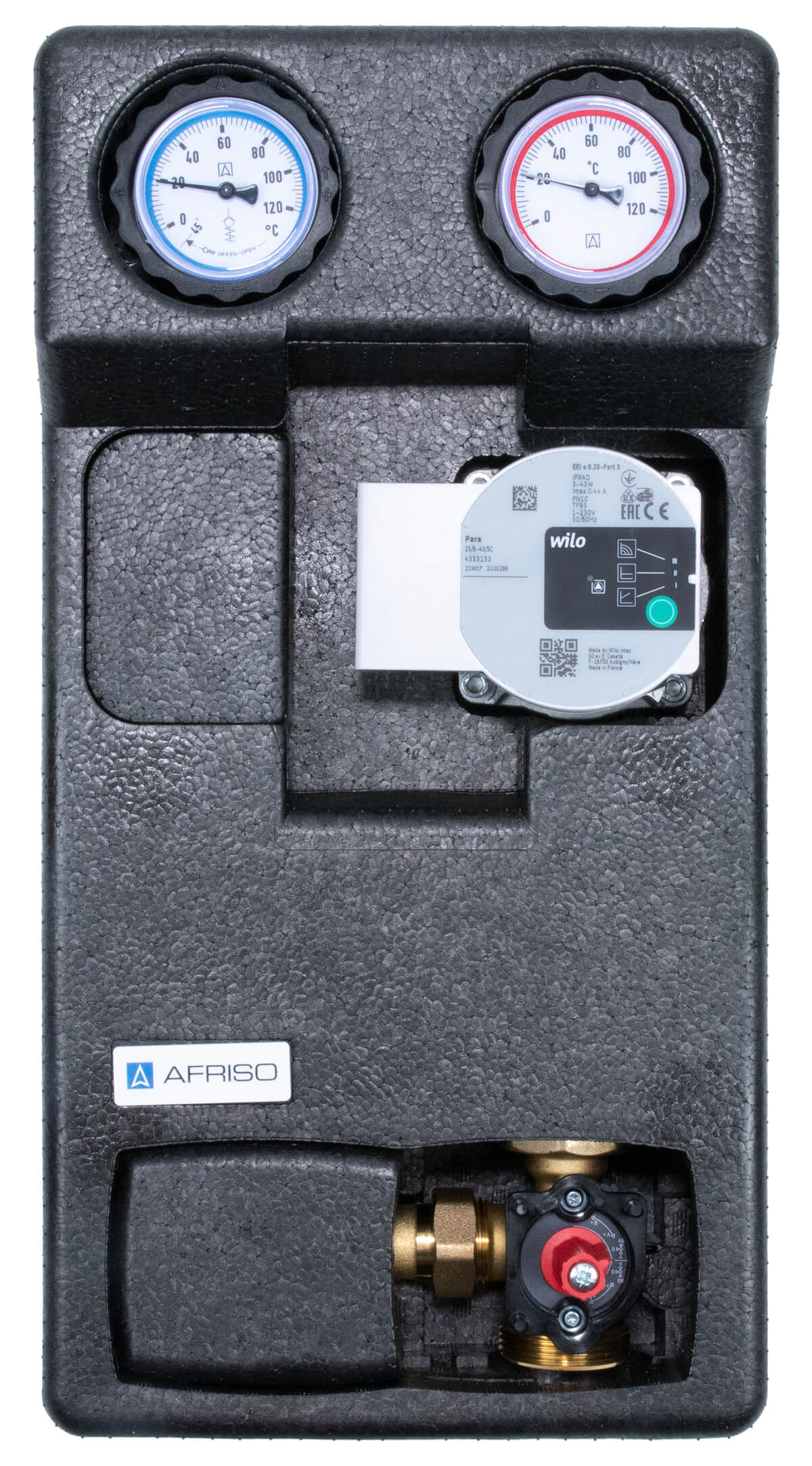Grupa pompowa AFRISO PrimoTherm 180-2 DN 25 WP 3-WM-SM Vario GZ x GW 1 1/2'' x 1'', z zaworem mieszającym, z izolacją, z pompą obiegową Wilo Para SC 25/6, z siłownikiem arm 343 proclick