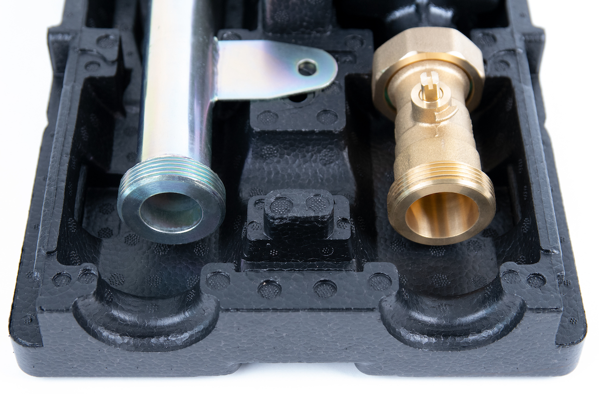 Wyposażona w niezbędne komponenty: termometry, zawór zwrotny, zawory odcinające na zasilaniu i powrocie, zawór odcinający przed pompą i izolację termiczną.