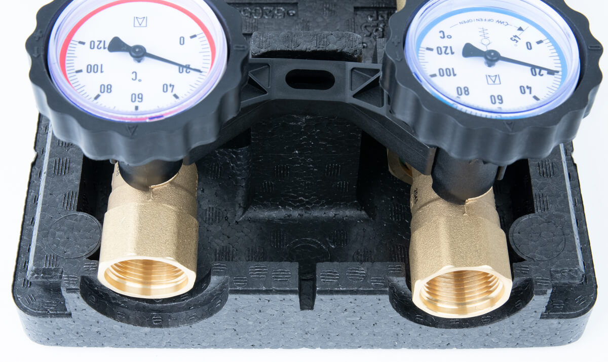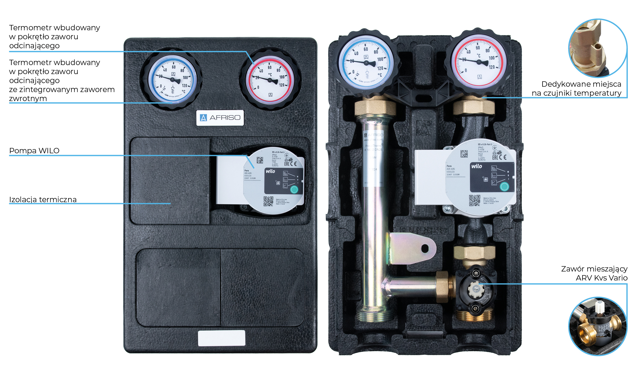 Wyposażona w niezbędne komponenty: termometry, zawór zwrotny, zawory odcinające na zasilaniu i powrocie oraz izolację termiczną.