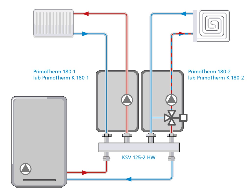 - Przeznaczona do przetłaczania medium w instalacji i regulacji temperatury zasilania obiegu grzewczego.