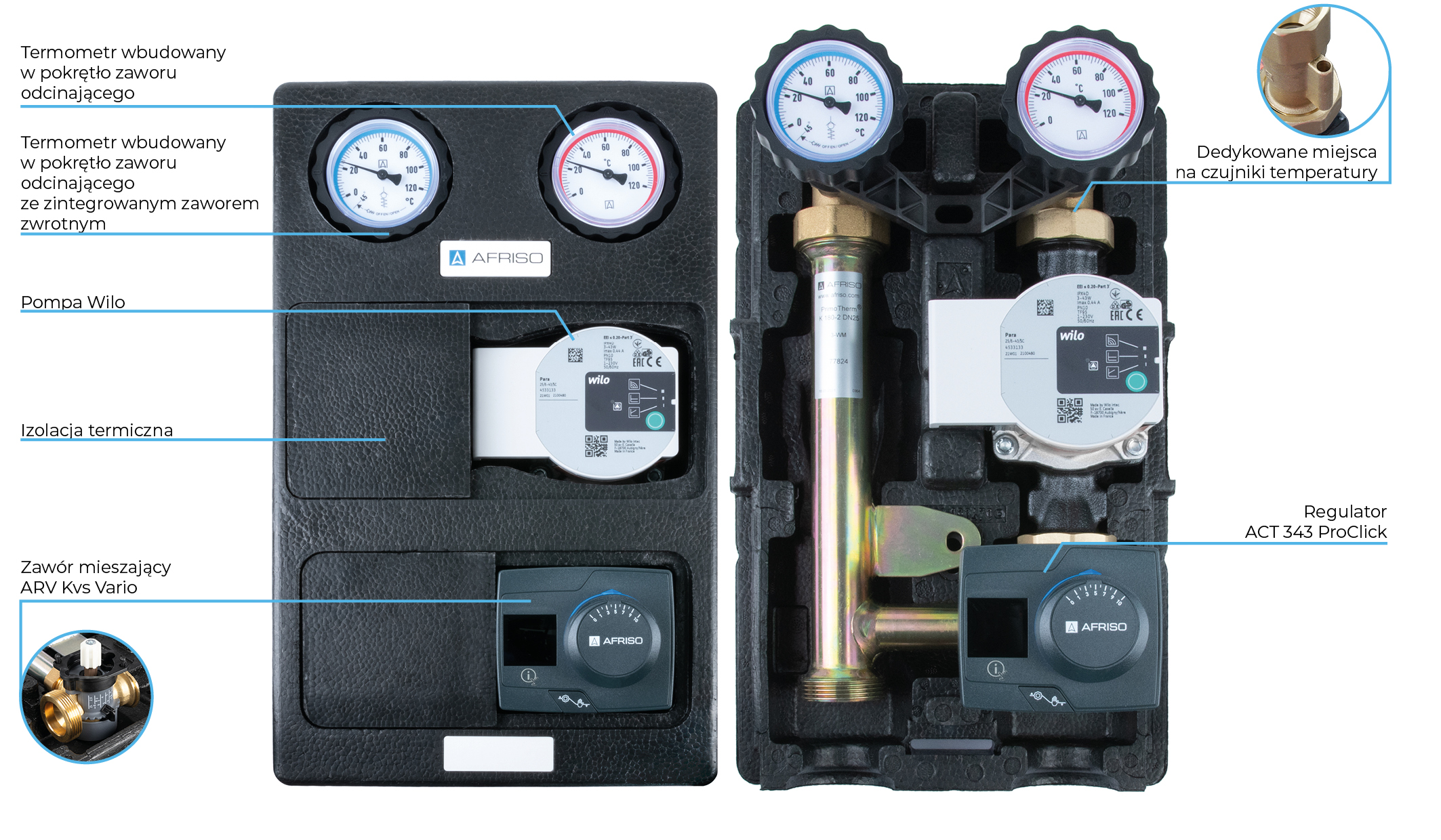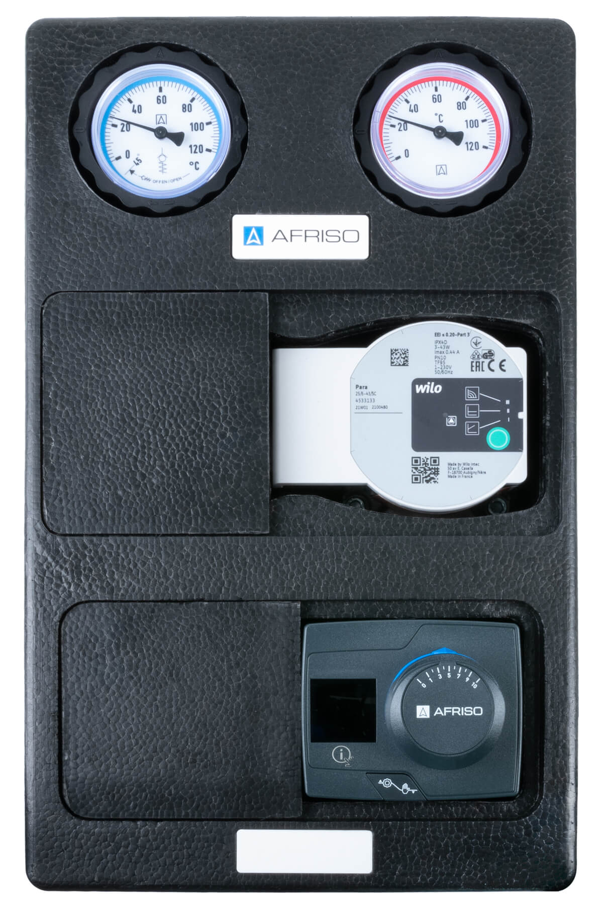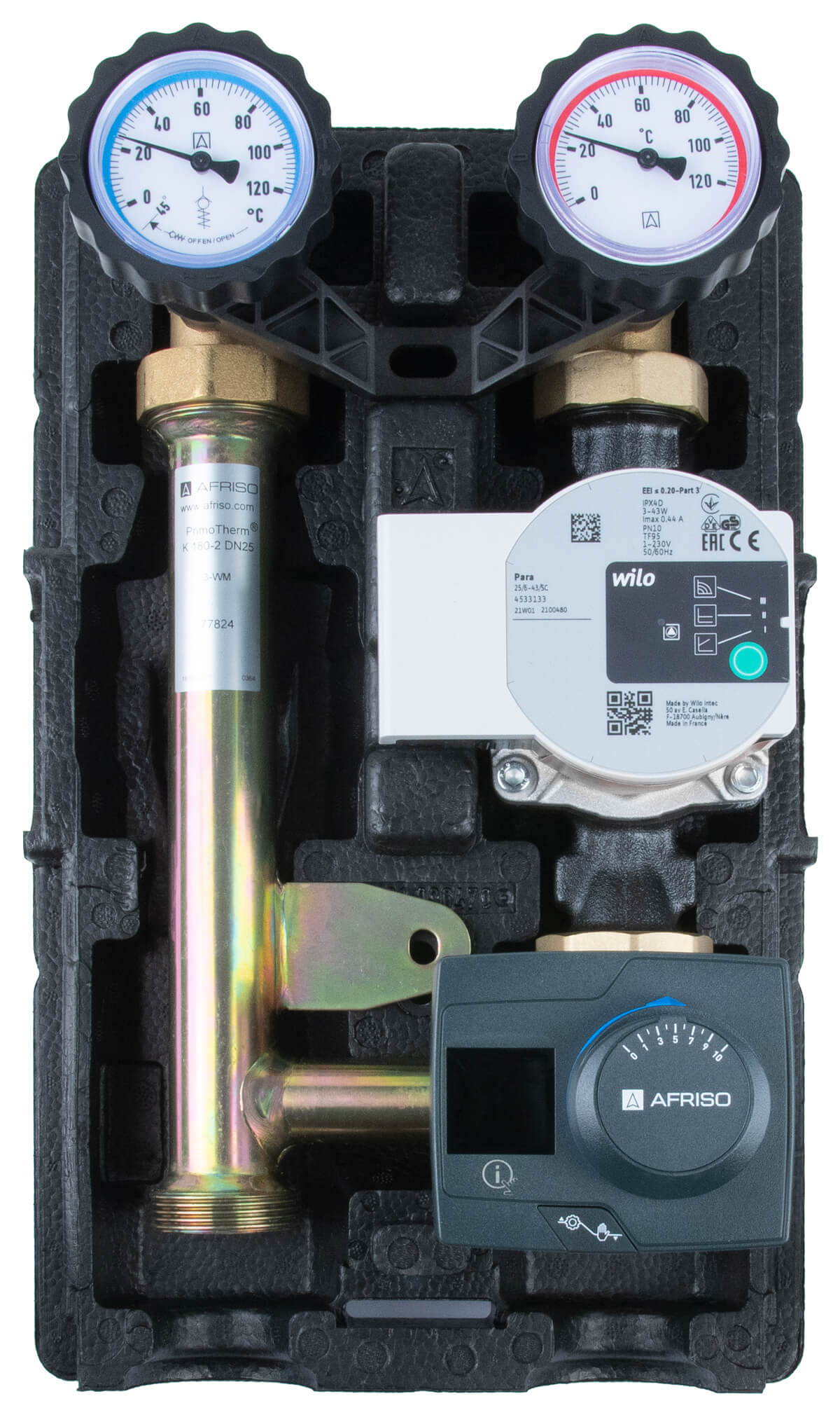 Grupa pompowa AFRISO PrimoTherm K 180-2 DN 25 WP 3-WM-R GZ x GW 1 1/2'' x 1'', z zaworem mieszającym, z izolacją, z pompą obiegową Wilo Para SC 25/6