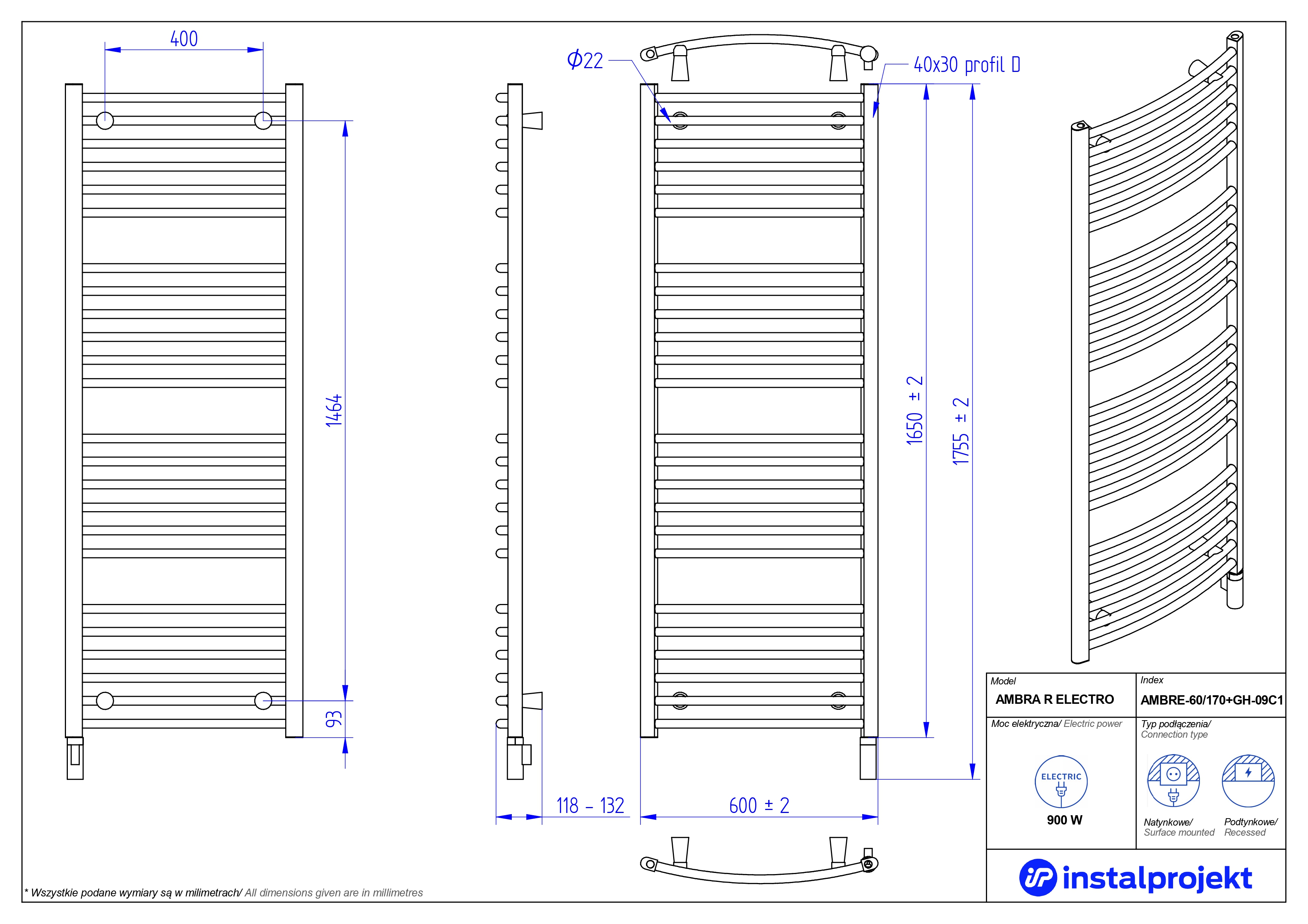 Grzejnik elektryczny (suszarka) INSTAL-PROJEKT AMBRA R ELECTRO, wym. 1650 (1755 z grzałką)/600 mm, kolor biały połysk, moc 900 W