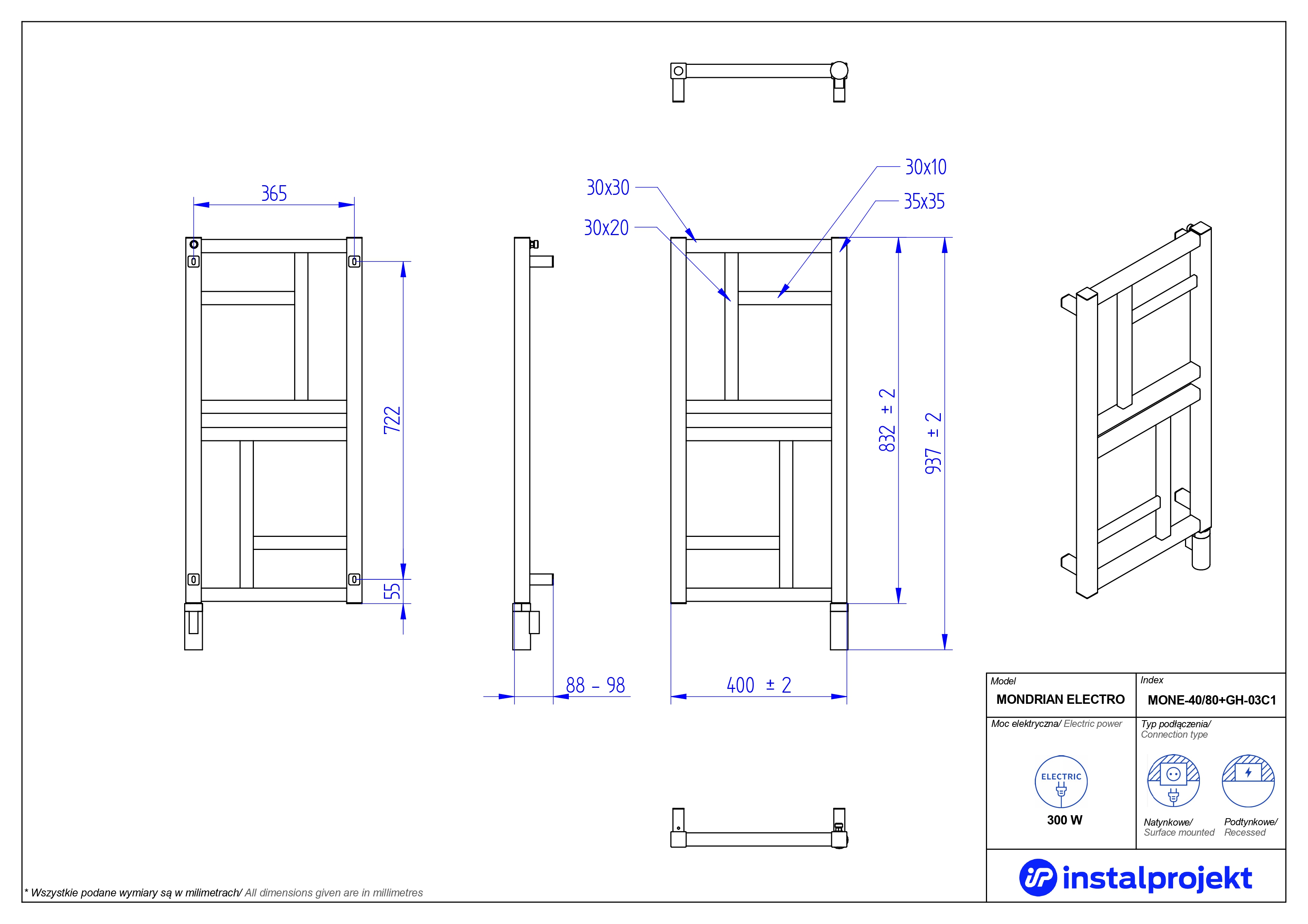 Grzejnik elektryczny (suszarka) INSTAL-PROJEKT MONDRIAN ELECTRO, wym. 832 (937 z grzałką)/400 mm, kolor czarny, moc 300 W