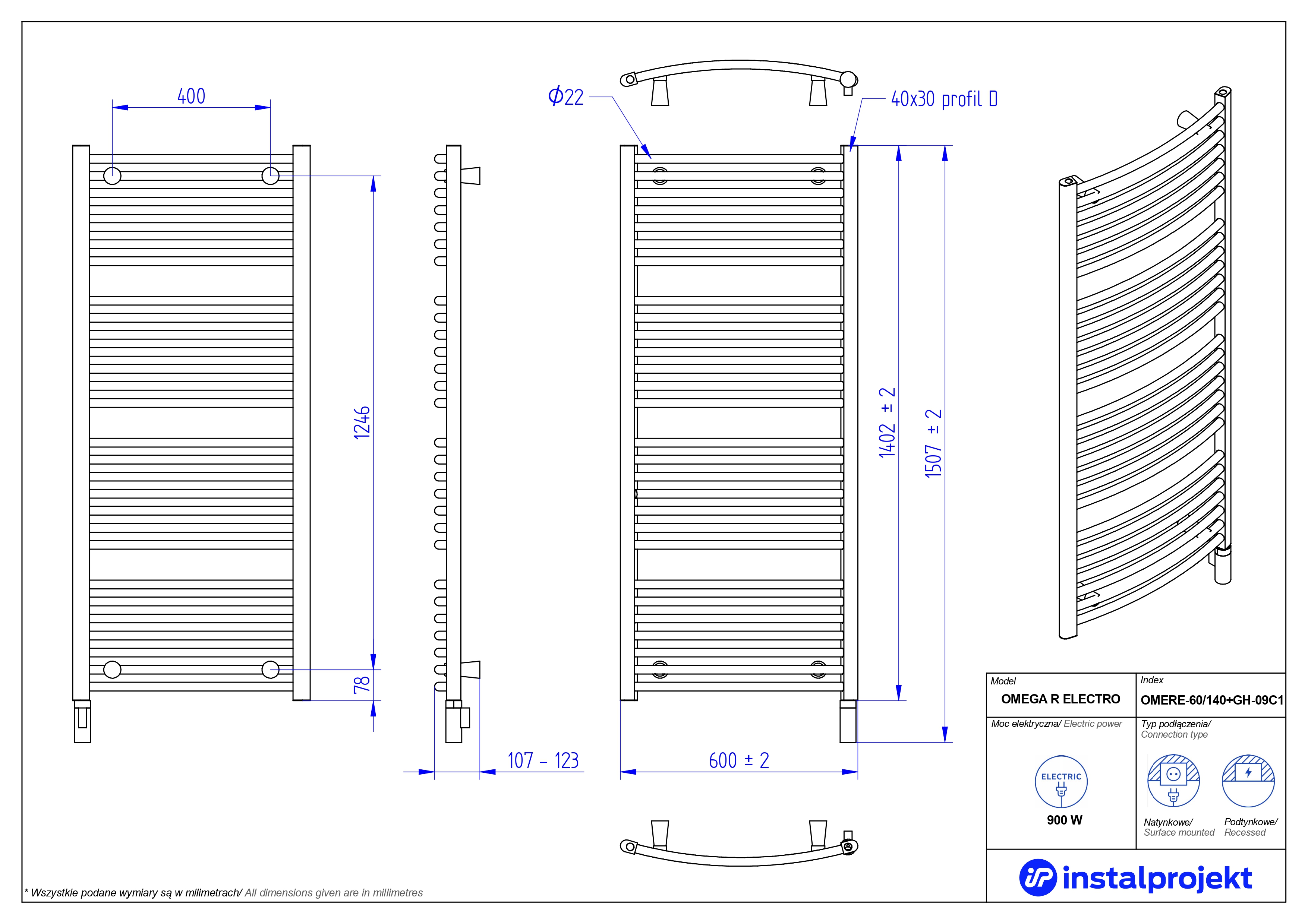 Grzejnik elektryczny (suszarka) INSTAL-PROJEKT OMEGA R ELECTRO, wym. 1402 (1507 z grzałką)/600 mm, kolor biały połysk, moc 900 W