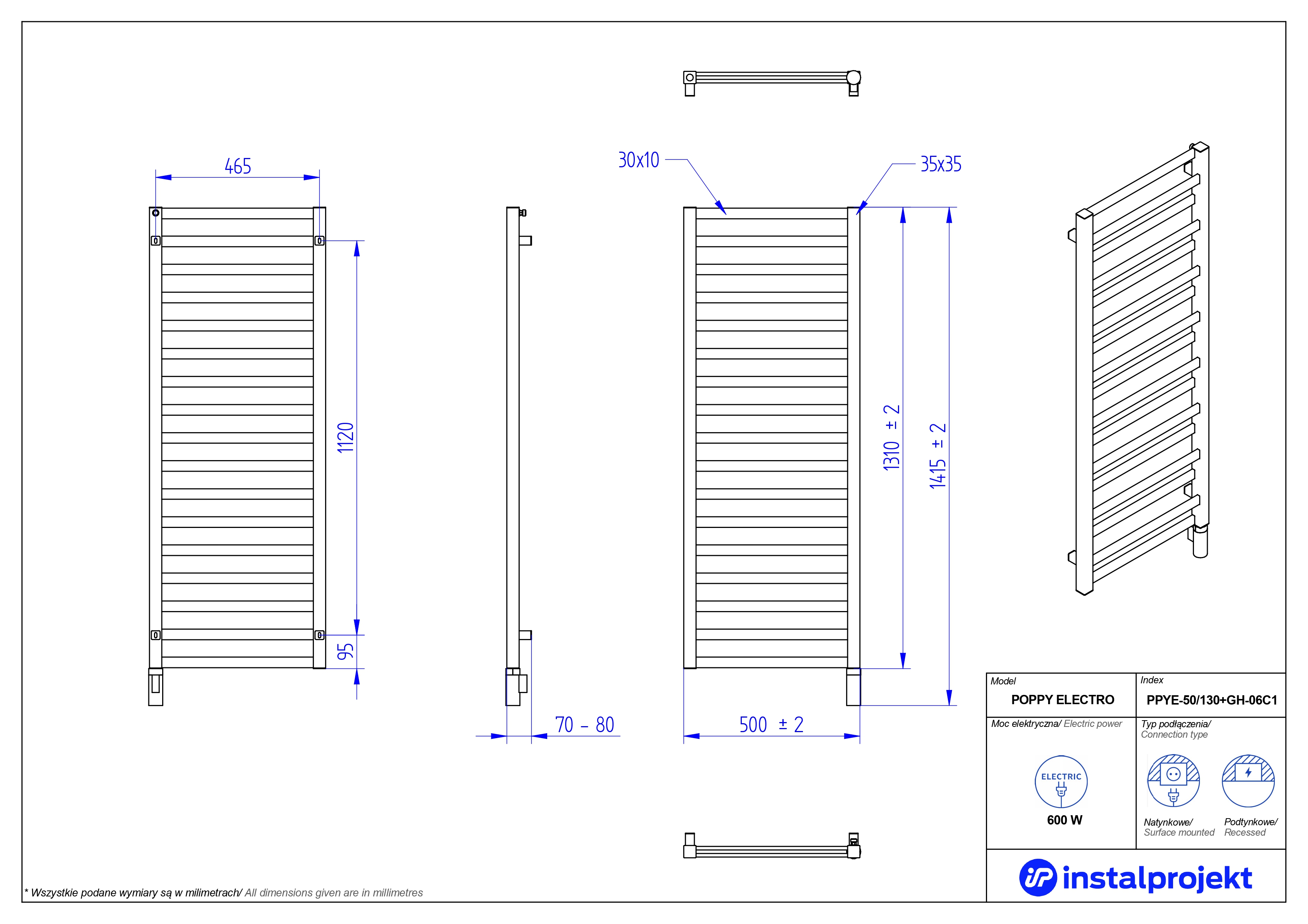 Grzejnik elektryczny POPPY ELECTRO to nowoczesne wydanie dobrze znanej drabinki. Oryginalności dodaje mu dwurzędowość poziomych, wąskich profili o prostokątnym przekroju. Wprowadza do wnętrz niezwykle modny, geometryczny akcent. Kształtowniki dodają przestronności, a zamknięta forma odpowiada za poczucie harmonii i spokoju. Grzejnik dostępny w czarnym i białym kolorze, w wersji matowej, z połyskiem i widoczną strukturą materiału ale również we wszystkich 23 kolorach z palety IP. Możliwe podłączenie podtynkowe, dzięki któremu urządzenie niejako staje się integralną częścią, bez wystających przewodów, tworząc piękny efekt spójności.