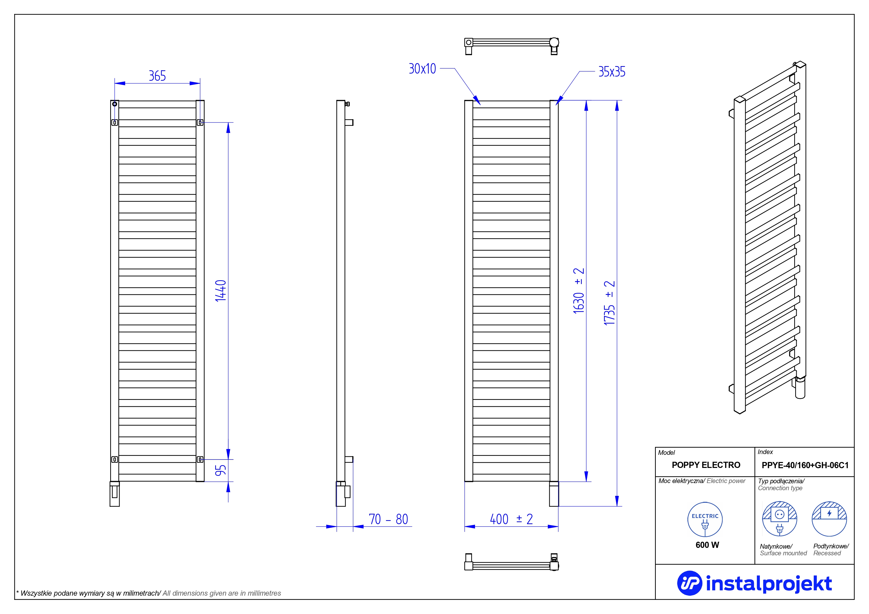 Grzejnik elektryczny POPPY ELECTRO to nowoczesne wydanie dobrze znanej drabinki. Oryginalności dodaje mu dwurzędowość poziomych, wąskich profili o prostokątnym przekroju. Wprowadza do wnętrz niezwykle modny, geometryczny akcent. Kształtowniki dodają przestronności, a zamknięta forma odpowiada za poczucie harmonii i spokoju. Grzejnik dostępny w czarnym i białym kolorze, w wersji matowej, z połyskiem i widoczną strukturą materiału ale również we wszystkich 23 kolorach z palety IP. Możliwe podłączenie podtynkowe, dzięki któremu urządzenie niejako staje się integralną częścią, bez wystających przewodów, tworząc piękny efekt spójności.