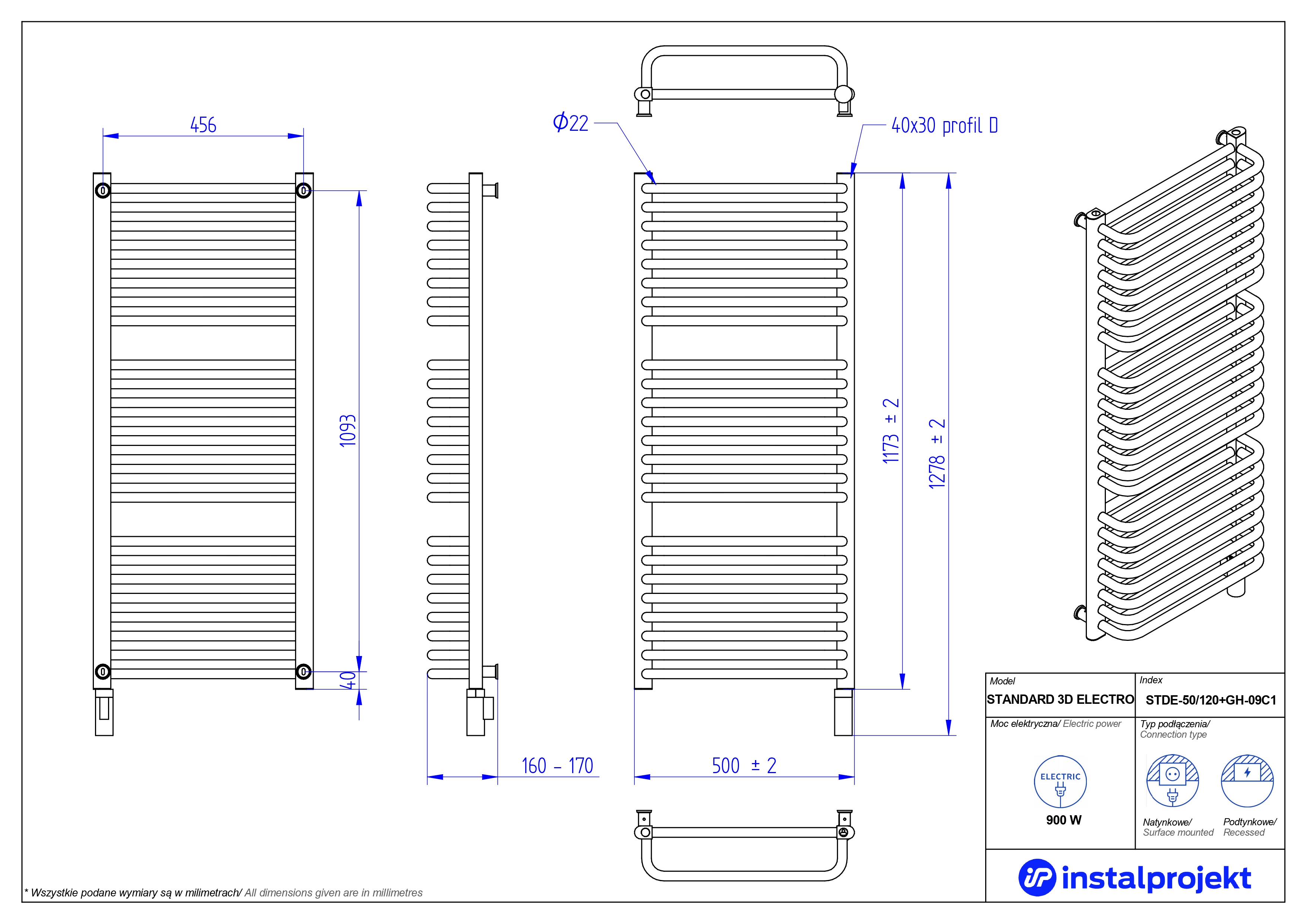 Grzejnik elektryczny (suszarka) INSTAL-PROJEKT STANDARD 3D ELECTRO, wym. 1173 (1278 z grzałką)/500 mm, kolor biały połysk, moc 900 W