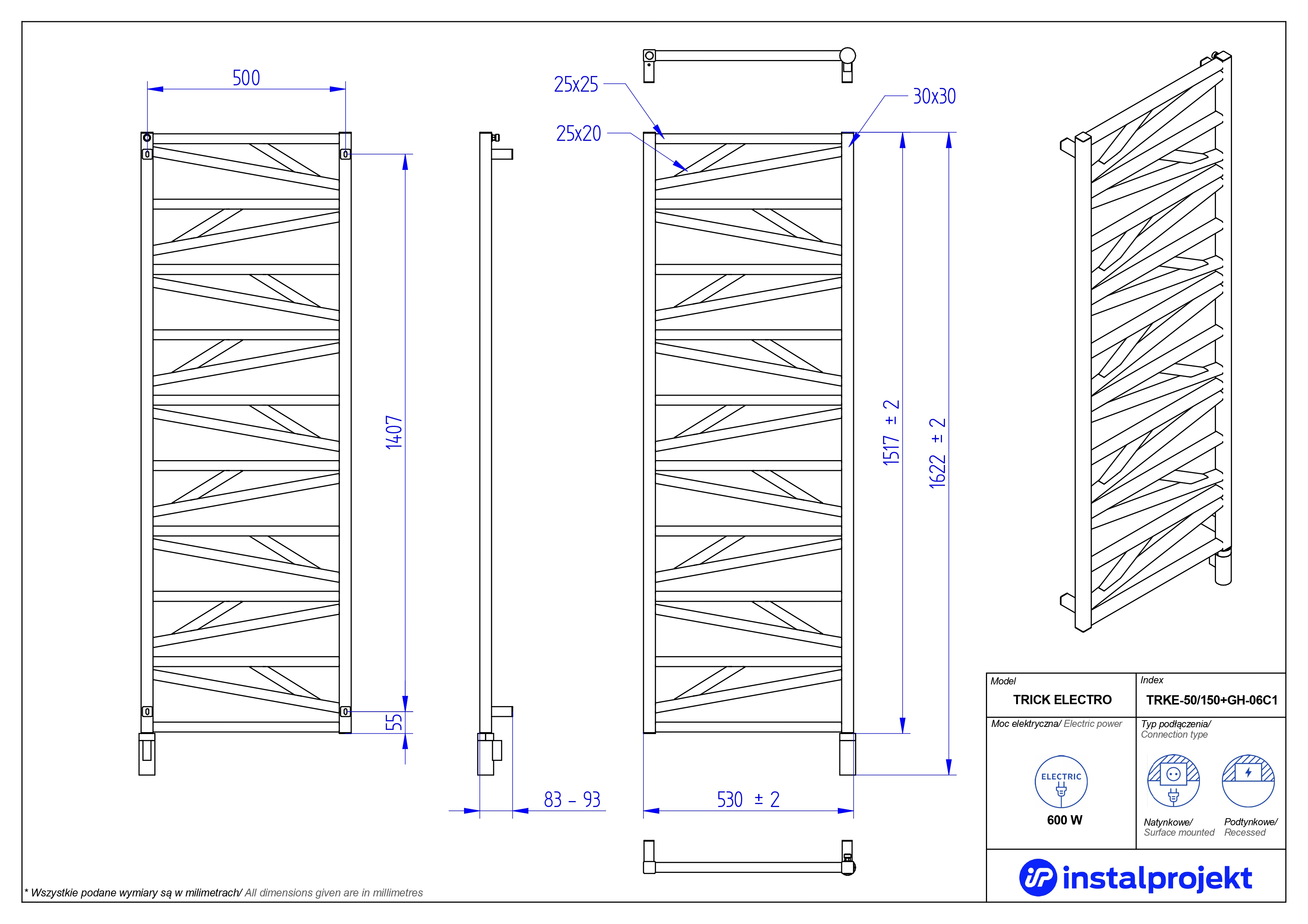 TRICK ELECTRO oferuje nie tylko oryginalny design, ale też dużą wygodę. Wynika ona z obecności poziomych profili, na których rozwiesisz niewielkie tekstylia, by je dosuszyć i oczywiście dużej wydajności grzewczej. Dzięki opatentowanej technologii urządzenie pobiera stosunkowo niewiele energii wobec ciepła, jakie generuje, uprzytulniając nawet dużą i chłodną łazienkę. Wykorzystano w nim najnowszy model grzałki elektrycznej: HOT2. Za jej sprawą grzejnik zyskał kilkustopniowe sterowanie dotykowe, timer, sygnalizację stanów alarmowych, a nawet tryb przeciwdziałający zamarzaniu. To oznacza łatwą obsługę dla wszystkich domowników. Urządzenie może zostać zamontowane na dwa sposoby: natynkowo lub podtynkowo.