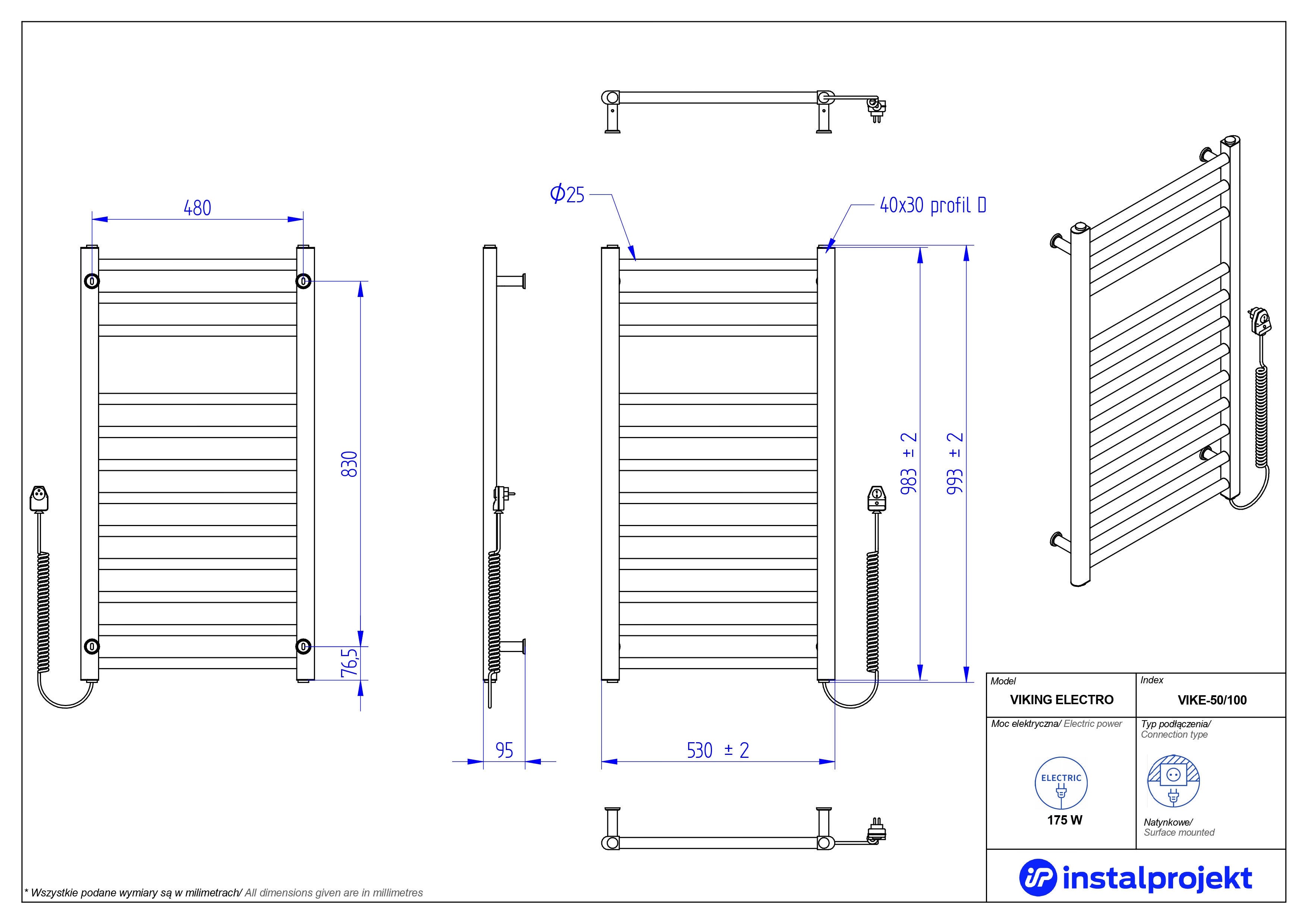 Grzejnik elektryczny (suszarka) INSTAL-PROJEKT VIKING ELECTRO, wym. 993/530 mm, kolor biały połysk, moc 175 W