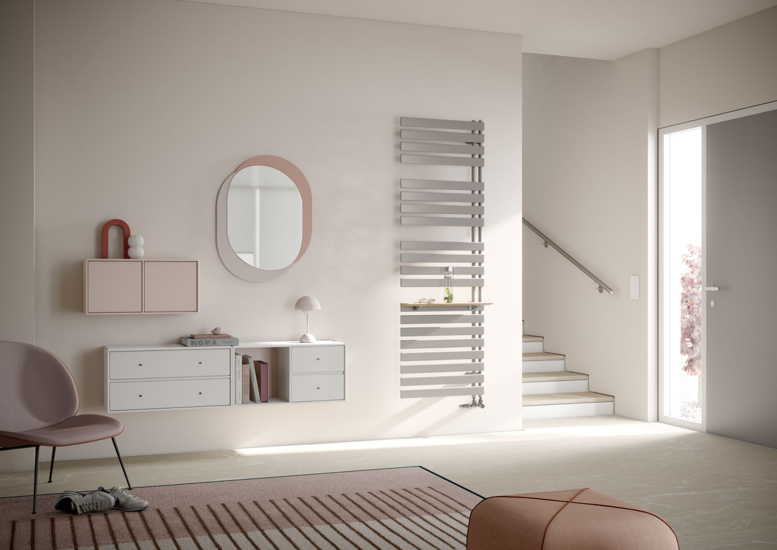 Asymetryczna forma i  rozmieszczenie płaskich prętów grzewczych w  blokach to cechy charakterystyczne Credo Half. Grzejnik jest z  jednej strony otwarty, co pozwala wygodnie zawieszać ręczniki. Grzejniki są dostępne w  wersjach prawej i  lewej. Opcjonalna półka z  drewna naturalnego stanowi elegancki, a  jednocześnie praktyczny akcent. Ciepła estetyka drewna w  ciekawy sposób kontrastuje ze stalowymi elementami grzejnika i  dodaje łazience przytulności.
