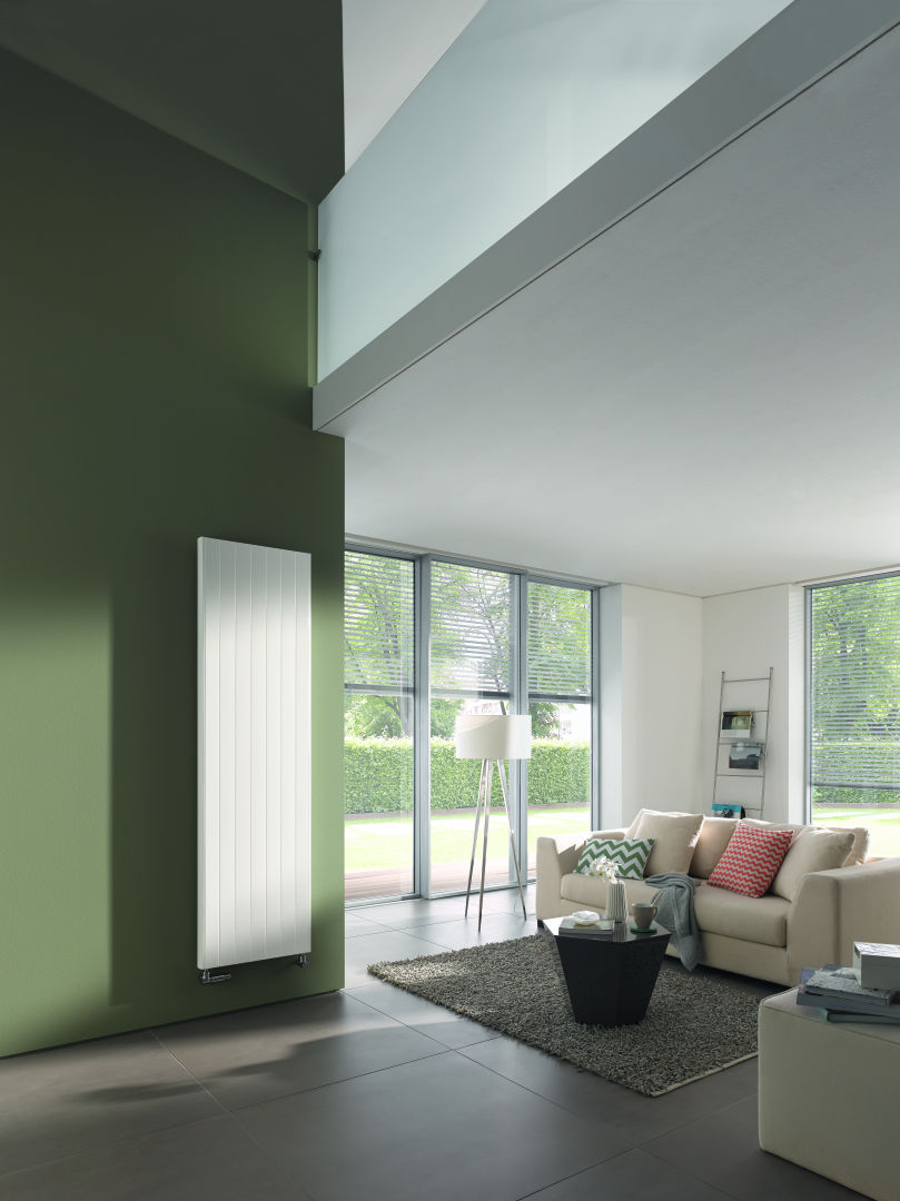 Smukły grzejnik płytowy pionowy gładki z pionowymi przetłoczeniami Kermi Verteo LINE PLS, podłączenie dolne, środkowe lub po zewnętrznej, zasilanie z lewej strony, możliwość podłączenia grzejnika od góry, gwint wewn. 6 x 1/2”, obieg wody wymuszony, stalowy, produkowany wg normy PN EN 442, posiada znak CE, deklarację DWU. Wysoka moc grzewcza – odpowiednia do niskich temperatur zasilania, np. pompy ciepła. Dostarczany z: kompletem mocowań do ściany, odpowietrznikiem, kompletem osłon bocznych (górna na zamówienie) wykonanych z blachy ocynkowanej – łatwych do zdjęcia (w celu wyczyszczenia) bez ruszania zawiesi. Standardowo kolor biel Kermi zbliżony do RAL 9016. Za dopłatą możliwość zamówienia grzejnika w kolorze z palety Kermi lub RAL Classic i z dodatkową powłoką antykorozyjną. Lakierowanie dwuwarstwowe. Grzejnik odtłuszczony, fosforanowany, zagruntowany zanurzeniowo ETL i lakierowany proszkowo EPS. Ciśnienie robocze 10 bar, temp. max. 110oC Grzejnik standardowo wyposażony w opatentowany system Therm-x2: szeregowe połączenie płyt grzejnika (najpierw zasilana jest płyta przednia, a następnie tylne płyty), co pozwala skrócić o 25 % czas rozgrzewania pomieszczenia oraz zwiększyć do 100% emisję energii przez promieniowanie. Wszystkie te funkcje, w połączeniu z zaworem ustawionym na odpowiednią wartość kV,, przyczyniają się do zmniejszenia kosztów energii aż do 11%. Często wydajność przedniej płyty jest wystarczająca a kolejna płyta uzyskuje funkcję ekranu przeciw wypromieniowaniu ciepła. Kolejne płyty grzeją dopiero przy zwiększonym zapotrzebowaniu na ciepło.