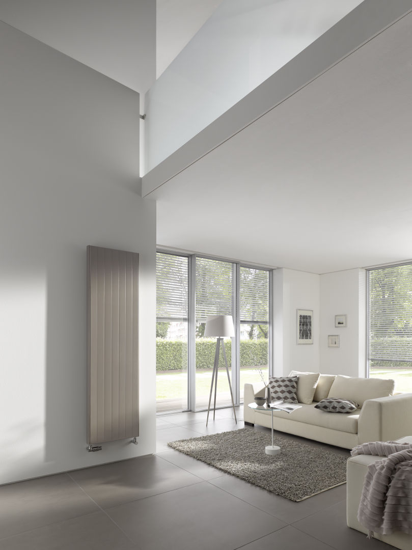 Smukły grzejnik płytowy pionowy gładki z pionowymi przetłoczeniami Kermi Verteo LINE PLS, podłączenie dolne, środkowe lub po zewnętrznej, zasilanie z lewej strony, możliwość podłączenia grzejnika od góry, gwint wewn. 6 x 1/2”, obieg wody wymuszony, stalowy, produkowany wg normy PN EN 442, posiada znak CE, deklarację DWU. Wysoka moc grzewcza – odpowiednia do niskich temperatur zasilania, np. pompy ciepła. Dostarczany z: kompletem mocowań do ściany, odpowietrznikiem, kompletem osłon bocznych (górna na zamówienie) wykonanych z blachy ocynkowanej – łatwych do zdjęcia (w celu wyczyszczenia) bez ruszania zawiesi. Standardowo kolor biel Kermi zbliżony do RAL 9016. Za dopłatą możliwość zamówienia grzejnika w kolorze z palety Kermi lub RAL Classic i z dodatkową powłoką antykorozyjną. Lakierowanie dwuwarstwowe. Grzejnik odtłuszczony, fosforanowany, zagruntowany zanurzeniowo ETL i lakierowany proszkowo EPS. Ciśnienie robocze 10 bar, temp. max. 110oC Grzejnik standardowo wyposażony w opatentowany system Therm-x2: szeregowe połączenie płyt grzejnika (najpierw zasilana jest płyta przednia, a następnie tylne płyty), co pozwala skrócić o 25 % czas rozgrzewania pomieszczenia oraz zwiększyć do 100% emisję energii przez promieniowanie. Wszystkie te funkcje, w połączeniu z zaworem ustawionym na odpowiednią wartość kV,, przyczyniają się do zmniejszenia kosztów energii aż do 11%. Często wydajność przedniej płyty jest wystarczająca a kolejna płyta uzyskuje funkcję ekranu przeciw wypromieniowaniu ciepła. Kolejne płyty grzeją dopiero przy zwiększonym zapotrzebowaniu na ciepło.