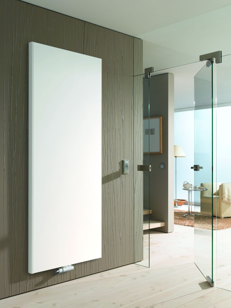Smukły grzejnik płytowy pionowy gładki Kermi Verteo PLAN PSN, podłączenie dolne, środkowe lub po zewnętrznej, zasilanie z lewej strony, możliwość podłączenia grzejnika od góry, gwint wewn. 6 x 1/2”, obieg wody wymuszony, stalowy, produkowany wg normy PN EN 442, posiada znak CE, deklarację DWU. Wysoka moc grzewcza – odpowiednia do niskich temperatur zasilania, np. pompy ciepła. Dostarczany z: kompletem mocowań do ściany, odpowietrznikiem, kompletem osłon bocznych (górna na zamówienie) wykonanych z blachy ocynkowanej – łatwych do zdjęcia (w celu wyczyszczenia) bez ruszania zawiesi. Standardowo kolor biel Kermi zbliżony do RAL 9016. Za dopłatą możliwość zamówienia grzejnika w kolorze z palety Kermi lub RAL Classic i z dodatkową powłoką antykorozyjną. Lakierowanie dwuwarstwowe. Grzejnik odtłuszczony, fosforanowany, zagruntowany zanurzeniowo ETL i lakierowany proszkowo EPS. Ciśnienie robocze 10 bar, temp. max. 110oC Grzejnik standardowo wyposażony w opatentowany system Therm-x2: szeregowe połączenie płyt grzejnika (najpierw zasilana jest płyta przednia, a następnie tylne płyty), co pozwala skrócić o 25 % czas rozgrzewania pomieszczenia oraz zwiększyć do 100% emisję energii przez promieniowanie. Wszystkie te funkcje, w połączeniu z zaworem ustawionym na odpowiednią wartość kV,, przyczyniają się do zmniejszenia kosztów energii aż do 11%. Często wydajność przedniej płyty jest wystarczająca a kolejna płyta uzyskuje funkcję ekranu przeciw wypromieniowaniu ciepła. Kolejne płyty grzeją dopiero przy zwiększonym zapotrzebowaniu na ciepło.