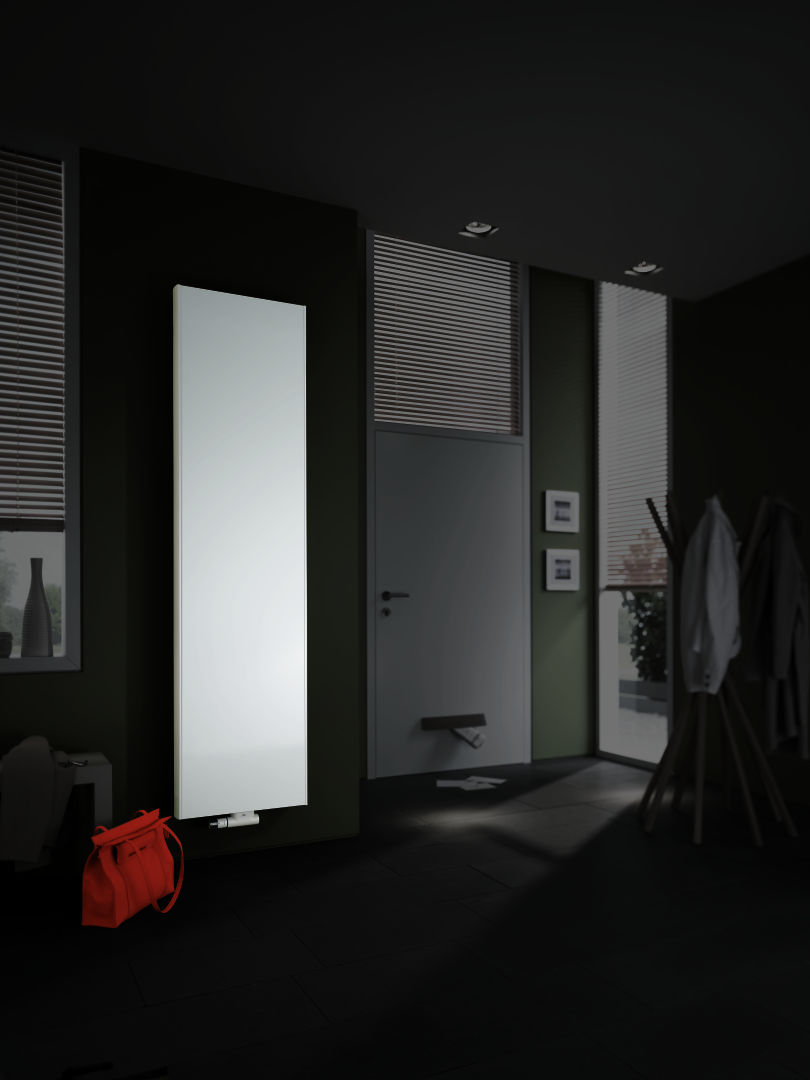 Smukły grzejnik płytowy pionowy gładki Kermi Verteo PLAN PSN, podłączenie dolne, środkowe lub po zewnętrznej, zasilanie z lewej strony, możliwość podłączenia grzejnika od góry, gwint wewn. 6 x 1/2”, obieg wody wymuszony, stalowy, produkowany wg normy PN EN 442, posiada znak CE, deklarację DWU. Wysoka moc grzewcza – odpowiednia do niskich temperatur zasilania, np. pompy ciepła. Dostarczany z: kompletem mocowań do ściany, odpowietrznikiem, kompletem osłon bocznych (górna na zamówienie) wykonanych z blachy ocynkowanej – łatwych do zdjęcia (w celu wyczyszczenia) bez ruszania zawiesi. Standardowo kolor biel Kermi zbliżony do RAL 9016. Za dopłatą możliwość zamówienia grzejnika w kolorze z palety Kermi lub RAL Classic i z dodatkową powłoką antykorozyjną. Lakierowanie dwuwarstwowe. Grzejnik odtłuszczony, fosforanowany, zagruntowany zanurzeniowo ETL i lakierowany proszkowo EPS. Ciśnienie robocze 10 bar, temp. max. 110oC Grzejnik standardowo wyposażony w opatentowany system Therm-x2: szeregowe połączenie płyt grzejnika (najpierw zasilana jest płyta przednia, a następnie tylne płyty), co pozwala skrócić o 25 % czas rozgrzewania pomieszczenia oraz zwiększyć do 100% emisję energii przez promieniowanie. Wszystkie te funkcje, w połączeniu z zaworem ustawionym na odpowiednią wartość kV,, przyczyniają się do zmniejszenia kosztów energii aż do 11%. Często wydajność przedniej płyty jest wystarczająca a kolejna płyta uzyskuje funkcję ekranu przeciw wypromieniowaniu ciepła. Kolejne płyty grzeją dopiero przy zwiększonym zapotrzebowaniu na ciepło.