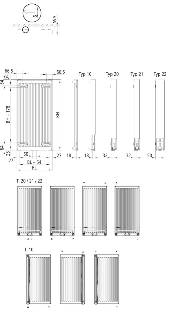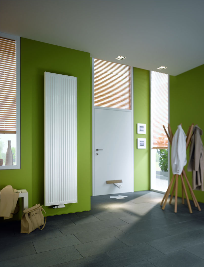 Smukły grzejnik płytowy pionowy profilowany Kermi Verteo Profil FSN, podłączenie dolne, środkowe lub po zewnętrznej, zasilanie z lewej strony, możliwość podłączenia grzejnika od góry, gwint wewn. 6 x 1/2”, obieg wody wymuszony, stalowy, produkowany wg normy PN EN 442, posiada znak CE, deklarację DWU. Wysoka moc grzewcza – odpowiednia do niskich temperatur zasilania, np. pompy ciepła. Dostarczany z: kompletem mocowań do ściany, odpowietrznikiem, kompletem osłon bocznych (górna na zamówienie) wykonanych z blachy ocynkowanej – łatwych do zdjęcia (w celu wyczyszczenia) bez ruszania zawiesi. Standardowo kolor biel Kermi zbliżony do RAL 9016. Za dopłatą możliwość zamówienia grzejnika w kolorze z palety Kermi lub RAL Classic i z dodatkową powłoką antykorozyjną. Lakierowanie dwuwarstwowe. Grzejnik odtłuszczony, fosforanowany, zagruntowany zanurzeniowo ETL i lakierowany proszkowo EPS. Ciśnienie robocze 10 bar, temp. max. 110oC Grzejnik standardowo wyposażony w opatentowany system Therm-x2: szeregowe połączenie płyt grzejnika (najpierw zasilana jest płyta przednia, a następnie tylne płyty), co pozwala skrócić o 25 % czas rozgrzewania pomieszczenia oraz zwiększyć do 100% emisję energii przez promieniowanie. Wszystkie te funkcje, w połączeniu z zaworem ustawionym na odpowiednią wartość kV,, przyczyniają się do zmniejszenia kosztów energii aż do 11%. Często wydajność przedniej płyty jest wystarczająca a kolejna płyta uzyskuje funkcję ekranu przeciw wypromieniowaniu ciepła. Kolejne płyty grzeją dopiero przy zwiększonym zapotrzebowaniu na ciepło.