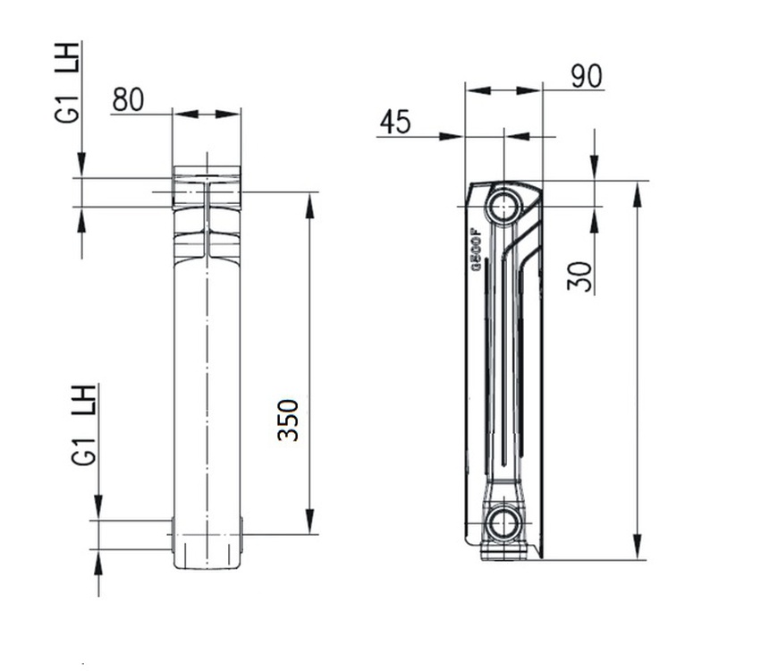 Grzejnik żeberkowy KFA Armatura G350F aluminium, podłączenie boczne 422 x 80 mm, kolor biały (RAL 9010)