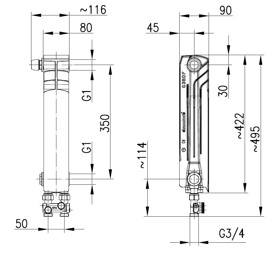 Grzejnik żeberkowy KFA Armatura G350F/D/1 aluminium, podłączenie dolne, lewe, proste 422 x 80 mm, kolor biały (RAL 9010)