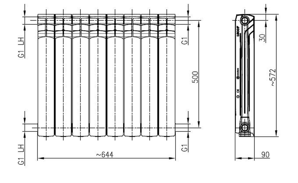 Grzejnik żeberkowy KFA Armatura G500/8 aluminium, podłączenie boczne 572 x 644 mm, kolor grafit (RAL 9007), moc 1128 W