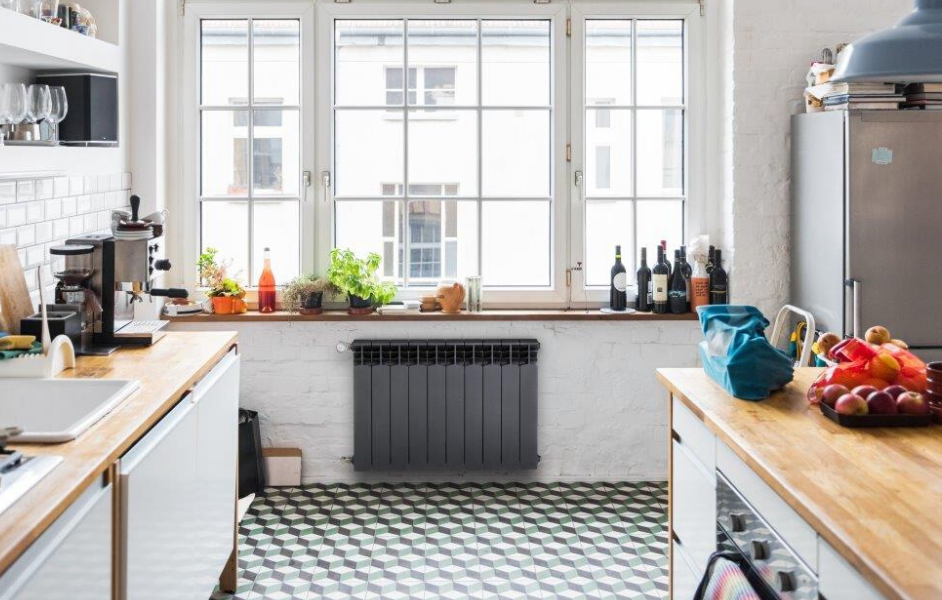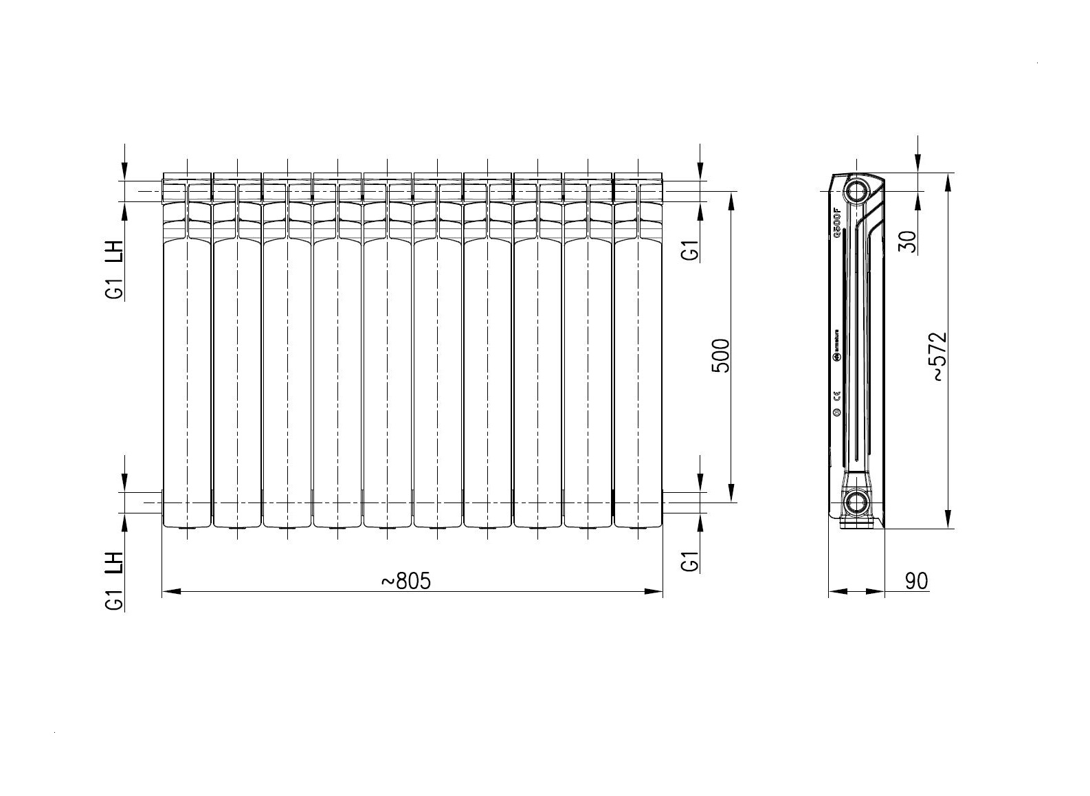 Grzejnik żeberkowy KFA Armatura G500F aluminium, podłączenie boczne 572 x 805 mm, kolor grafit (RAL 9007)