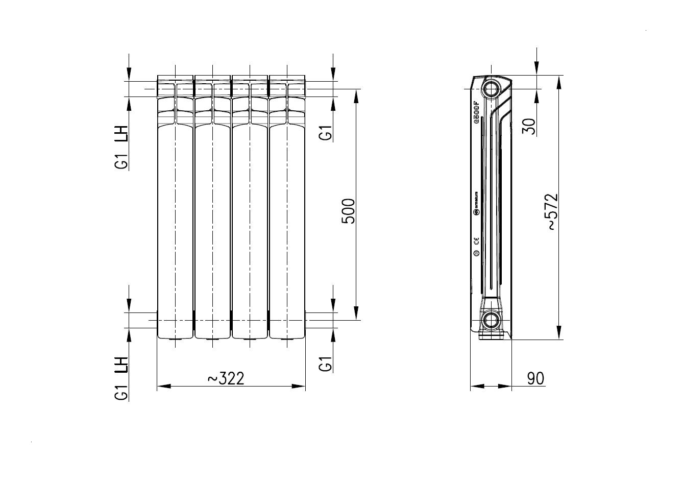 Grzejnik żeberkowy KFA Armatura G500F/4 aluminium, podłączenie boczne 572 x 322 mm, kolor biały (RAL 9010)