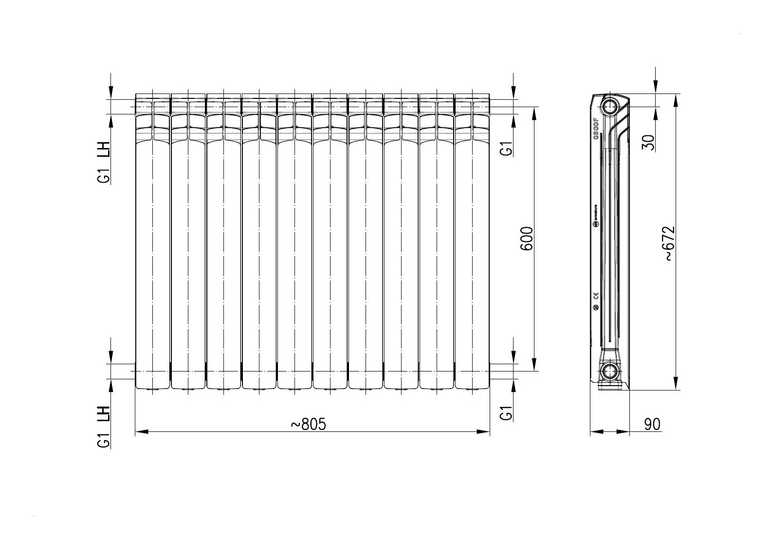 Grzejnik żeberkowy KFA Armatura G600F/10 aluminium, podłączenie boczne 672 x 805 mm, kolor biały