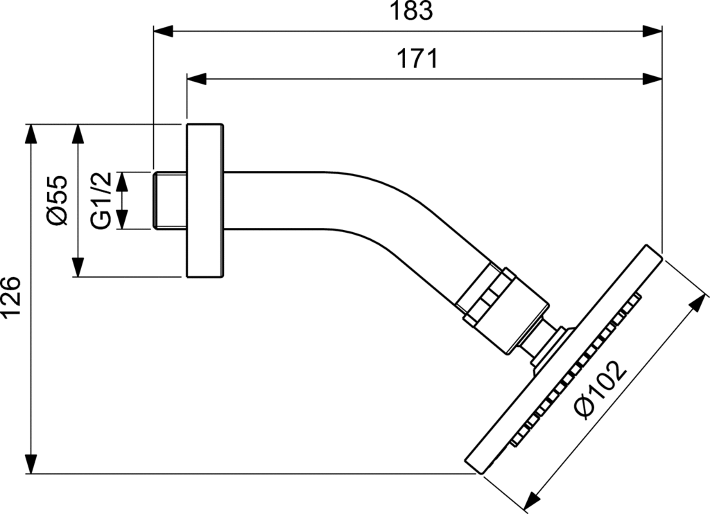 Okrągła deszczownica Idealrain o średnicy 100 mm. z ramieniem ściennym. Ramię narożne 118 mm. Metalowa rozeta, chromowana.