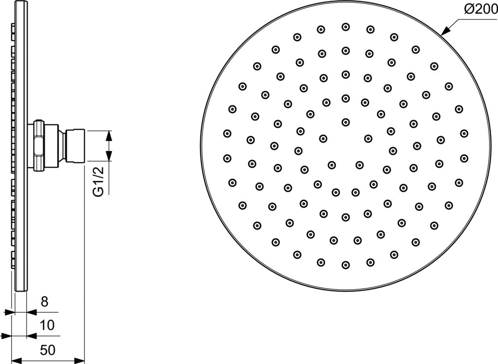 Okrągła deszczownica Idealrain o średnicy 200 mm. Ogranicznik przepływu 12 l/min. Do zamontowania z ramionami. B9444AA, B9445AA lub B9446AA (ściennymi lub sufitowym).