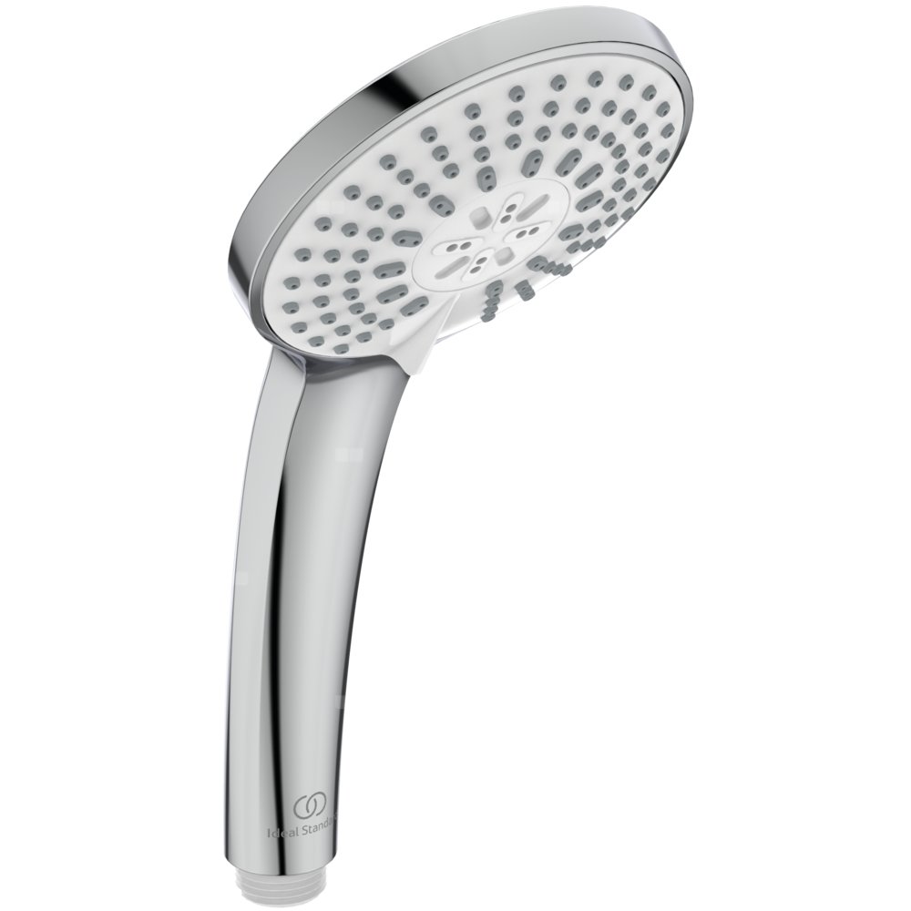 Słuchawka prysznicowa trójfunkcyjna. Gumowe końcówki dysz zapobiegające osadzaniu się kamienia. Ogranicznik przepływu wody do 8 l/min. Logo Ideal Standard, ręczna dźwignia prysznicowa.