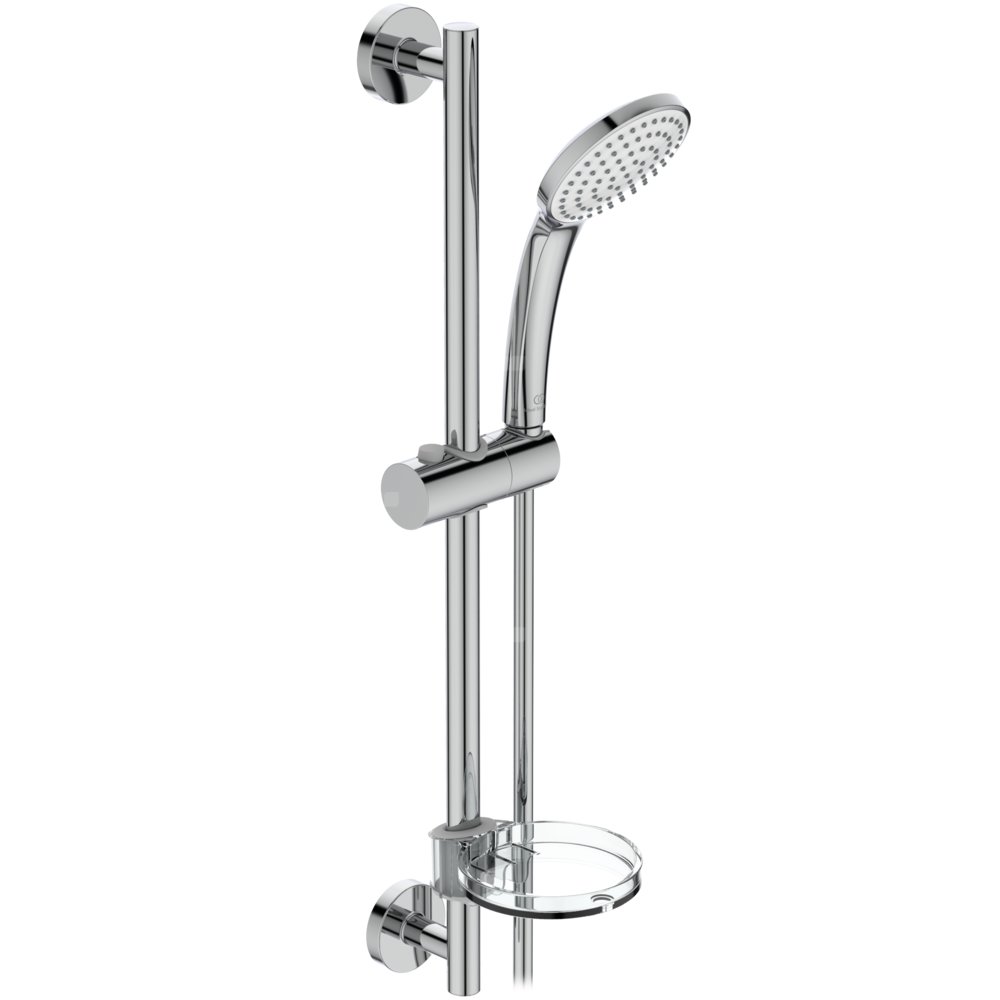 Zestaw natryskowy: Jednofunkcyjna słuchawka o średnicy 100 mm. Wąż Idealflex 1750 mm. Uchwyt ścienny przesuwny 600 mm (21 mm średnicy). Plastikowa transparentna mydelniczka. Logo Ideal Standard.