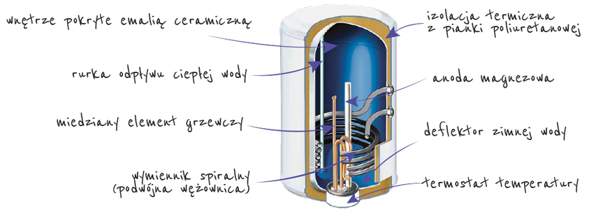 Wbudowany wymiennik spiralny o średniej mocy, możliwość produkcji c.w.u. przez cały rok dzięki zainstalowanej miedzianej grzałce nurkowej, zewnętrzny termometr, zewnętrzne pokrętło regulacji zakresu temperatury, izolacja termiczna wykonana z pianki poliuretanowej, system ochrony antykorozyjnej O’PRO, profilowany deflektor wlotu zimnej wody, tryb FROST FREE – temp. pracy 7°C – ochrona przed zamarznięciem, 3-funkcyjny termostat temperatury z zakresem regulacji temperatury 15-65°C , nastawa fabryczna 65°C, model naścienny, wiszący w pozycji pionowej, materiał – stal wysokogatunkowa, kolor biały (RAL 9016), uchwyt mocujący urządzenie do ściany, mufka dielektryczna, zawór bezpieczeństwa, automatyczny bezpiecznik termiczny, zasilanie ~230 V/50 Hz