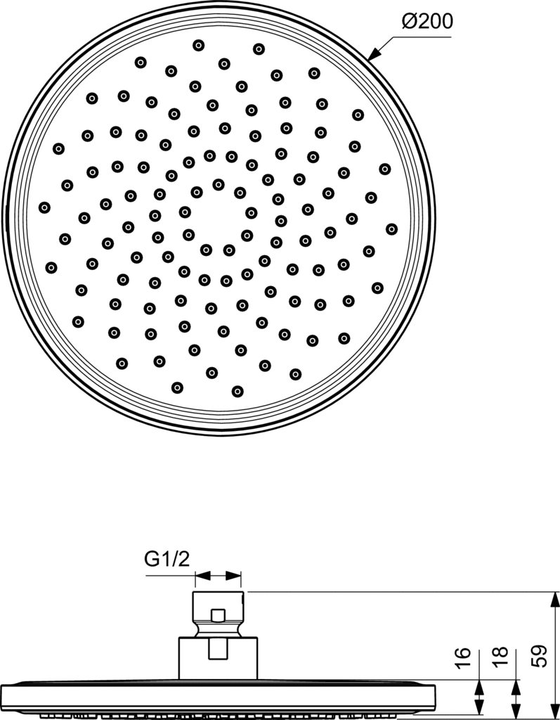 Jednofunkcyjna deszczownica, Ø200 mm, z tworzywa. Ogranicznik przepływu 12 l/min. Gumowe końcówki dysz zapobiegające osadzaniu się kamienia.