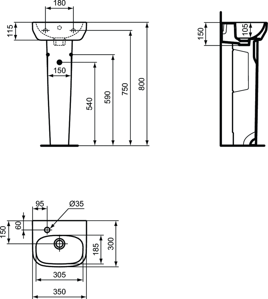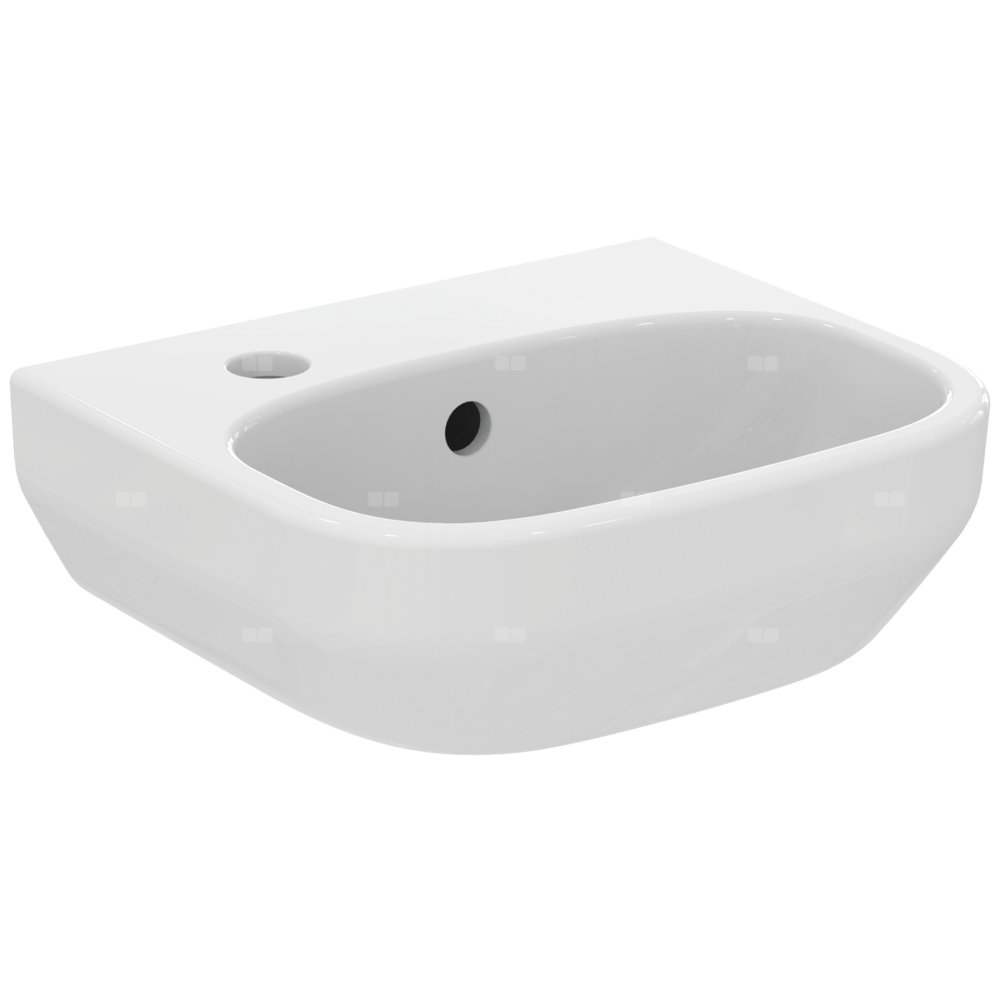 Umywalka do mycia rąk z wybitym otworem na baterię po lewej stronie oraz z przelewem. Do montażu z małym postumentem T471401 lub samodzielnie z syfonem.