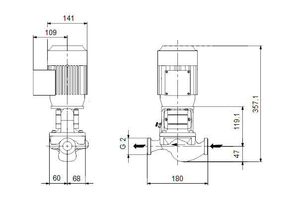 Jednostopniowa, spiralna pompa z krótkim sprzęgłem i króćcem ssawnym i tłocznym, o identycznej średnicy, w jednej osi (in-line). Pompy mają konstrukcję umożliwiającą demontaż od góry (typu "top-pull-out"), tj. głowica napędowa (silnik, głowica pompy i wirnik) może być wyjmowana w celu konserwacji lub serwisowania, gdy korpus pompy pozostaje przyłączony do rurociągów. Pompa jest wyposażona w nieodciążone uszczelnienie z mieszkiem gumowym. Uszczelnienie wału to jest zgodne z DIN EN 12756. Pompa jest wyposażona w asynchroniczny silnik elektryczny chłodzony wentylatorem.