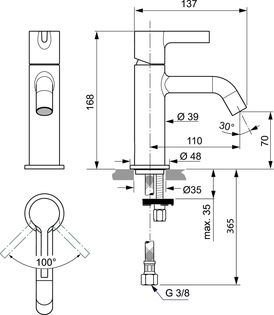 Głowica ceramiczna 28 mm z ogranicznikiem temperatury wody. Logo Ideal Standard umieszczone na korpusie baterii. Metalowy uchwyt bez oznaczenia wody ciepłej i zimnej. Aerator typu Caché M16,5x1 z ogranicznikiem przepływu wody do 5 l/min. System montażu EASY-FIX. Wężyki przyłączeniowe G3/8".