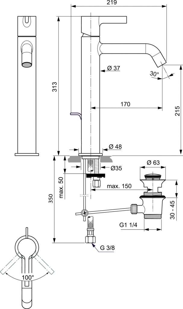 Głowica ceramiczna 28 mm z ogranicznikiem temperatury wody. Logo Ideal Standard umieszczone na korpusie baterii. Metalowy uchwyt bez oznaczenia wody ciepłej i zimnej. Aerator typu Caché M16,5x1 z ogranicznikiem przepływu wody do 5 l/min. System montażu EASY-FIX. Wężyki przyłączeniowe G3/8". Metalowy korek automatyczny.